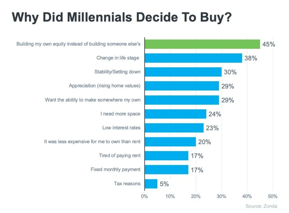 This graph shows why millennials are buying homes according to Zonda’s 6th annual millennial survey. The top reasons include building equity, a change in life stage, wanting stability, rising home values, and wanting to make somewhere truly their own. Here’s a look at each in more detail.