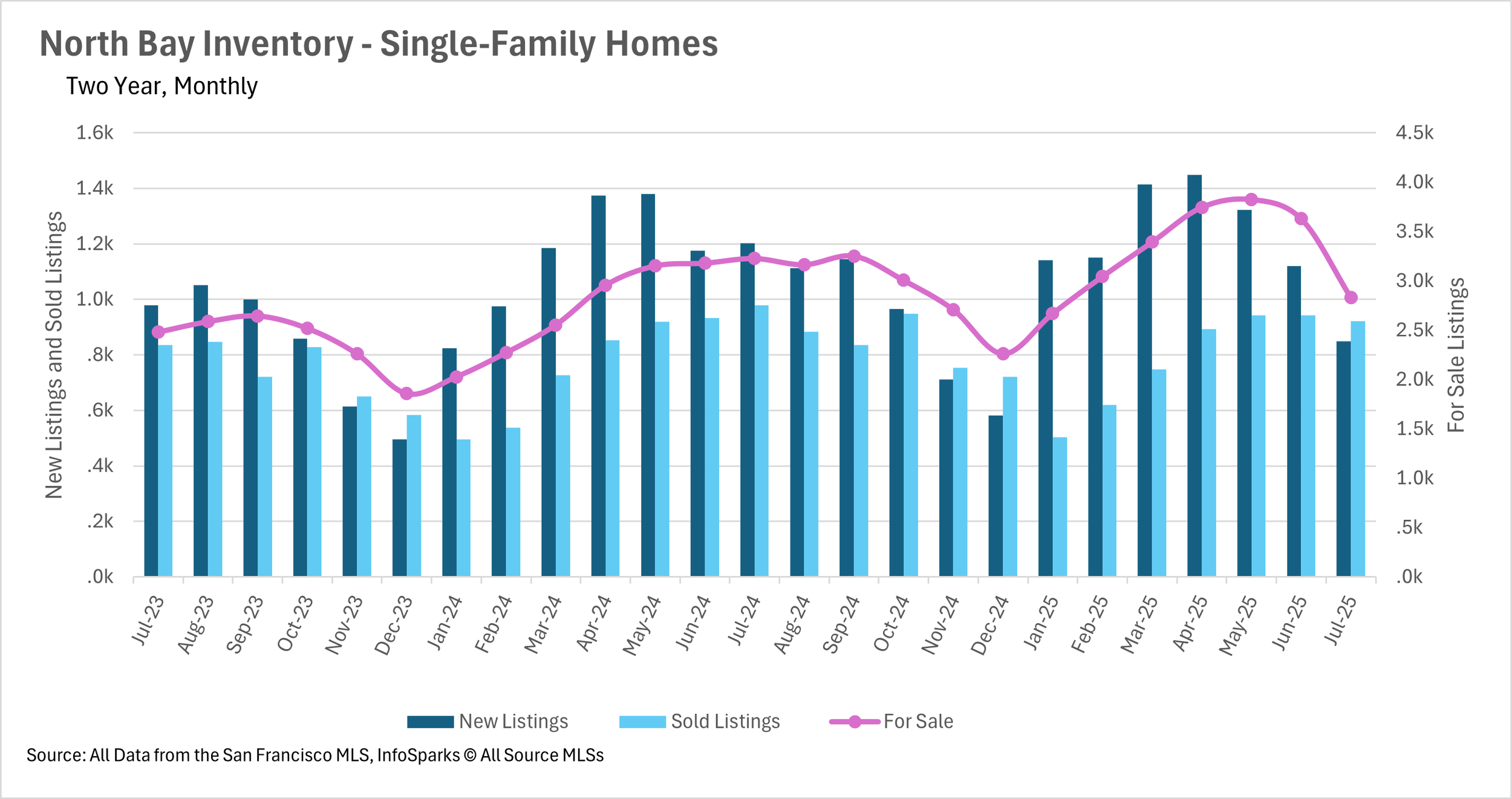 San Francisco's inventory crisis continues to deepen, with 15.93% less single-family inventory and 19.91% fewer condos available compared to last year. This stands in sharp contrast to Silicon Valley, where inventories have grown 7.63% for single-family homes and 25.86% for condos year-over-year. The East Bay is experiencing similar inventory growth with a 15.68% increase in active single-family listings, while the North Bay has seen dramatic month-over-month inventory drops of 21.98% for single-family homes, largely attributed to record-low levels of new listings in July.