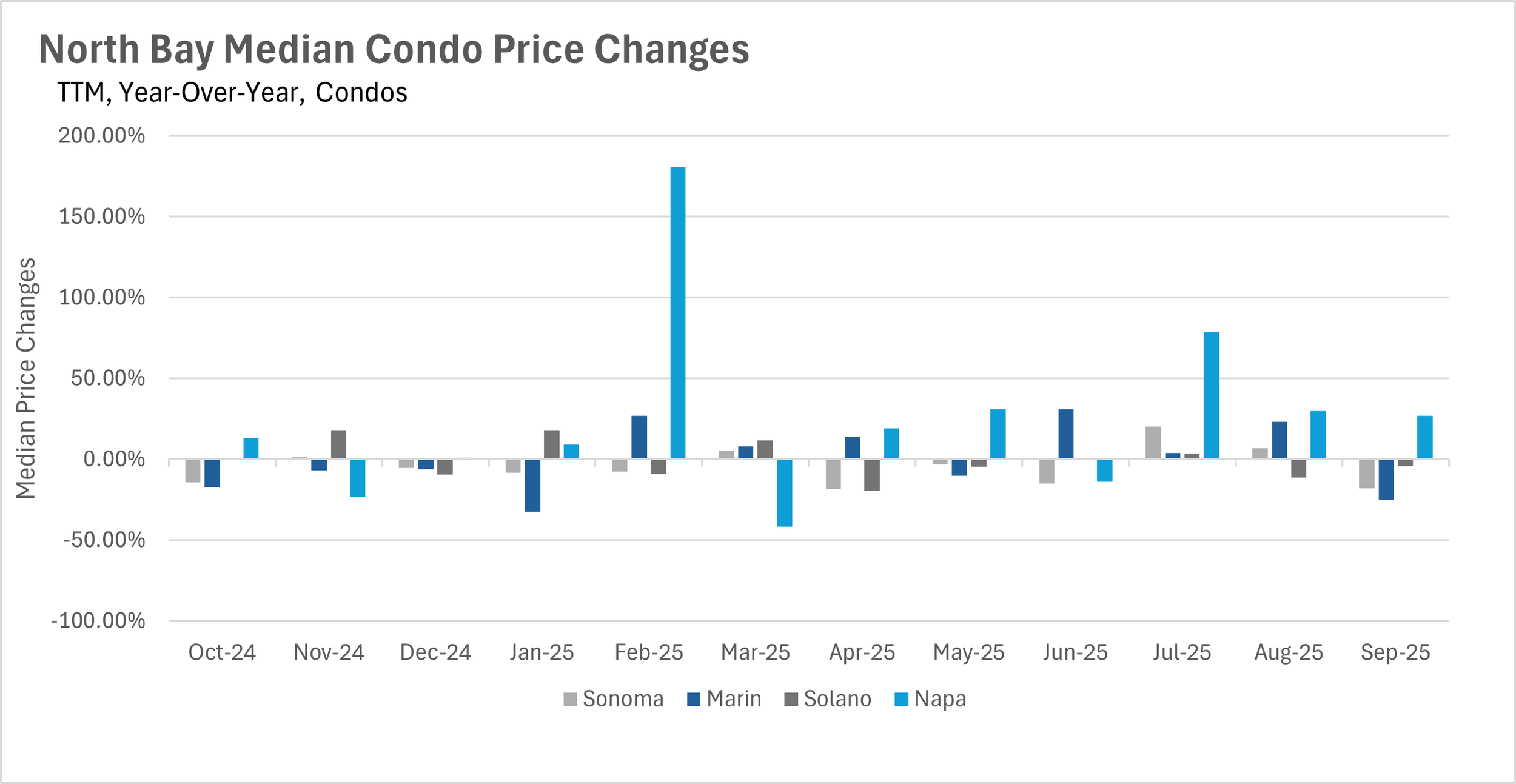 The condo market continued its downward trend for the second consecutive month with declines of 3.88% in San Mateo, 3.01% in Santa Clara, and 2.53% in Santa Cruz. The East Bay returned to year-over-year declines after August's brief respite, with single-family homes down 1.98% in Alameda County and 1.59% in Contra Costa, though prices remain well within their historical bands. Condos in Contra Costa County declined 4.21% year-over-year. The North Bay showed the most uniform pattern with near-stagnant pricing across the board - Sonoma, Marin, and Solano Counties all posted small declines of 3.47%, 1.43%, and 0.81% respectively, while Napa County managed a tiny 0.17% premium to last year's prices.