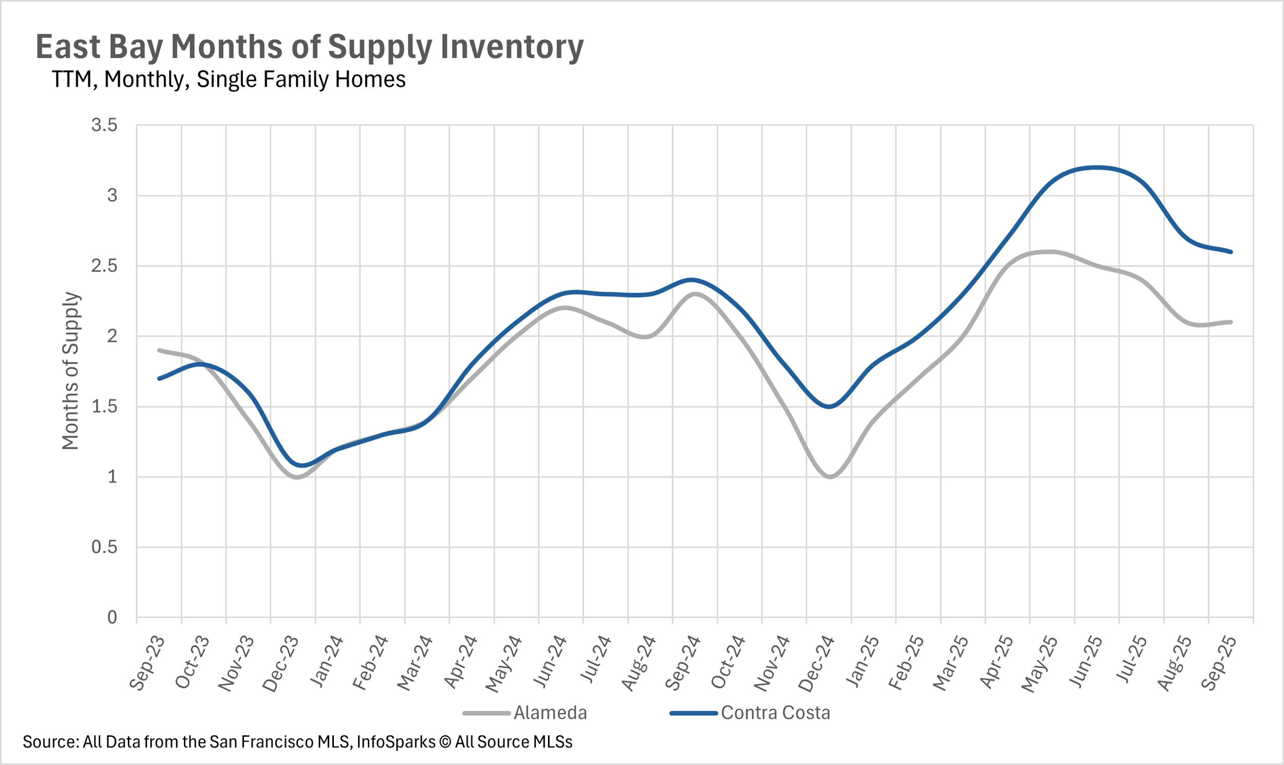 The North Bay experienced its first year-over-year inventory decline in several months, with single-family listings down 2.98%, driven by a sharp 14.75% drop in new listings and a 3.95% increase in sold listings, resulting in a dramatic 12.14% month-over-month inventory decline. Condo inventory remained slightly elevated at 3.49% above last year. The East Bay showed continued normalization with single-family inventory at just 2.41% above last year and condos at 6.75% above, both representing substantial improvements from summer peaks. The normalization was aided by nearly 10% more single-family homes sold in September compared to last year.