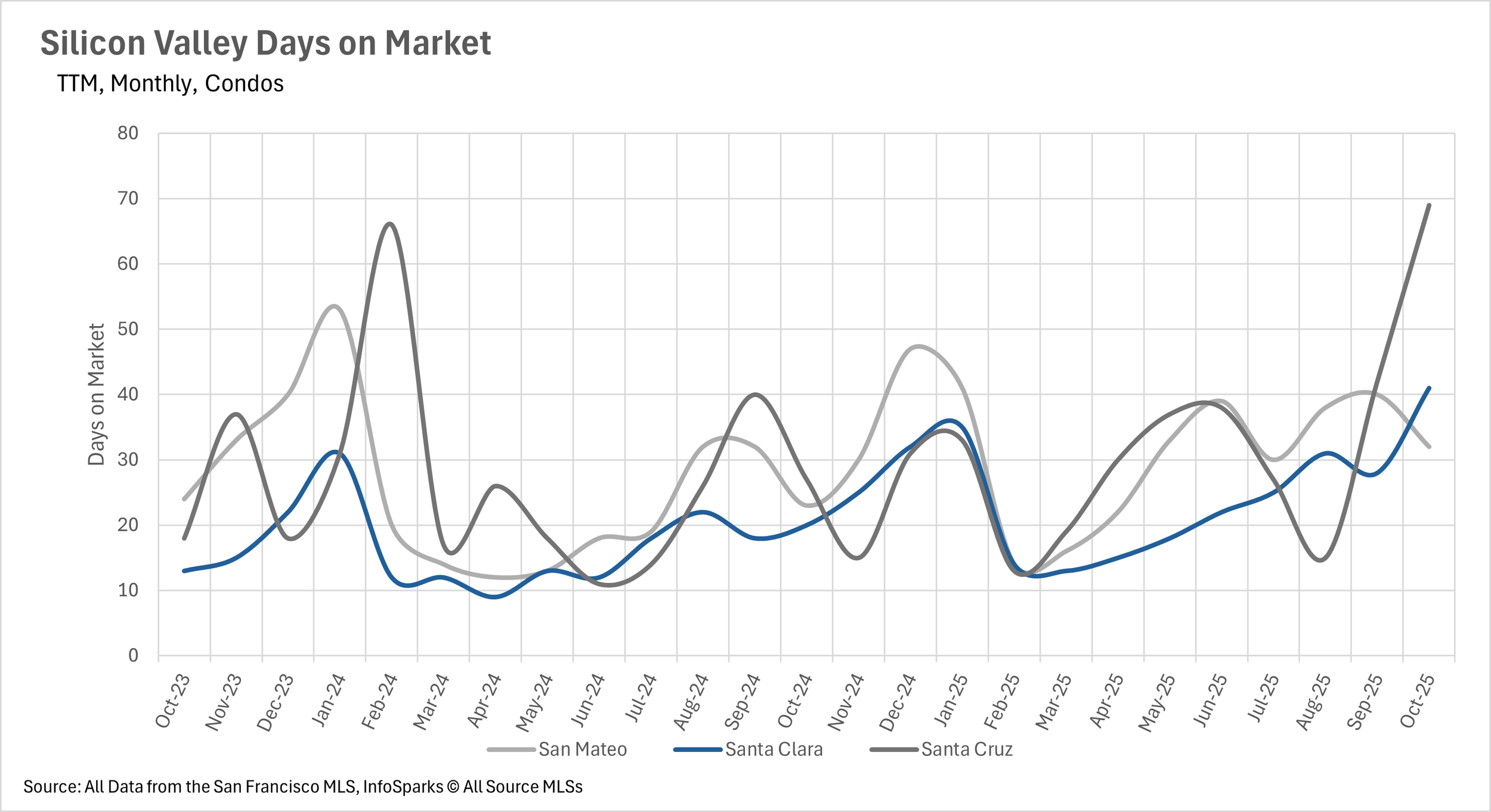 Although we saw some pretty drastic moves on a percentage basis in the single-family home market in terms of average days on market, single-family listings are still moving relatively quickly. The average single-family home in San Mateo and Santa Clara Counties spends 13 and 12 days on the market, respectively. However, the average Santa Cruz County single-family home listing is spending 32 days on the market, representing a 52.38% year-over-year increase. When we turn to the condo market, we see a much different picture being painted, though. San Mateo condos are spending 32 days on the market, representing a 39.13% increase, and Santa Clara and Santa Cruz County condos are spending more than twice as much time on the market as they did last year, with it taking 41 and 69 days for the average listing to sell, respectively. This represents a 105% and a 155.56% year-over-year increase!
