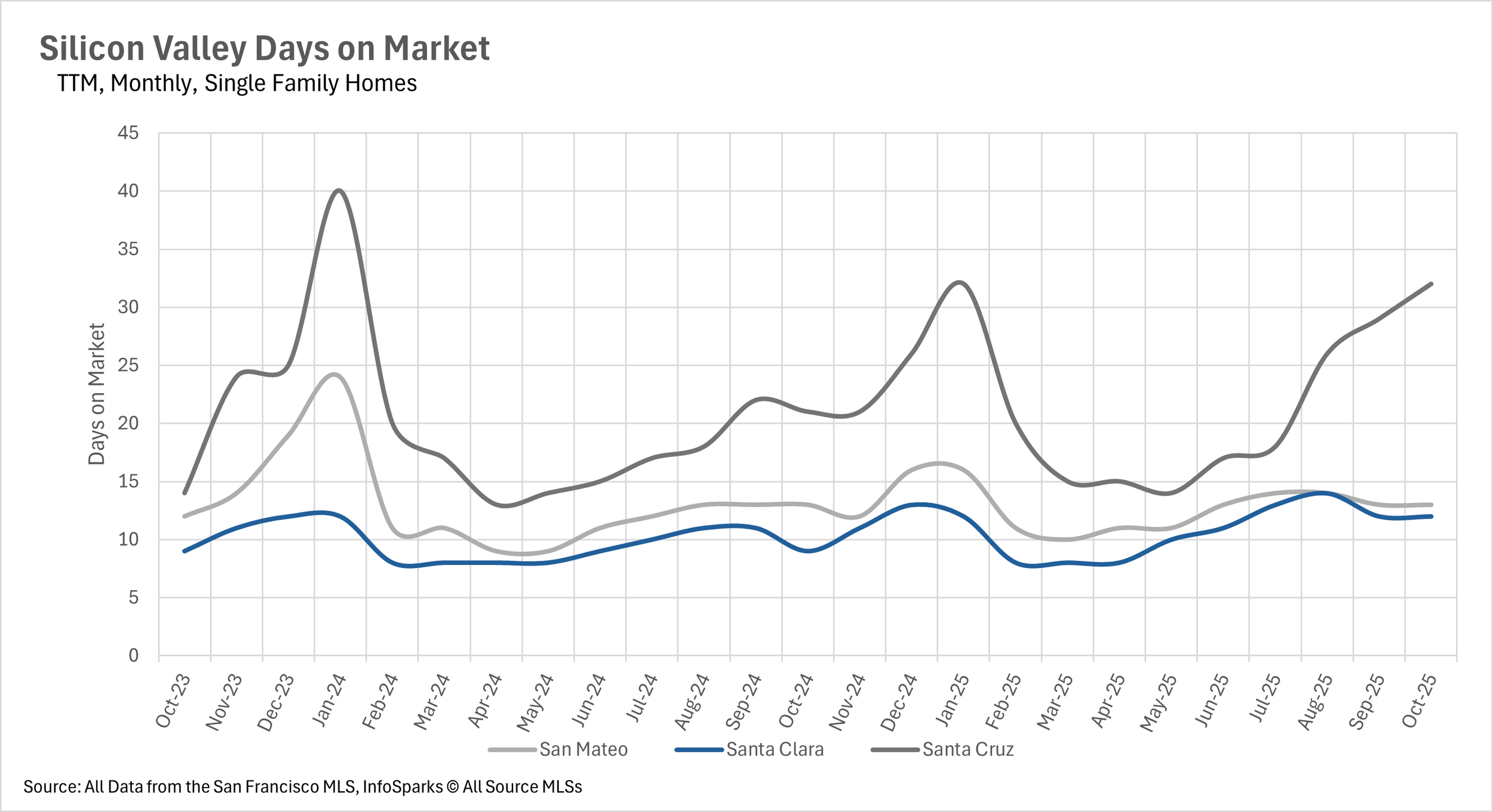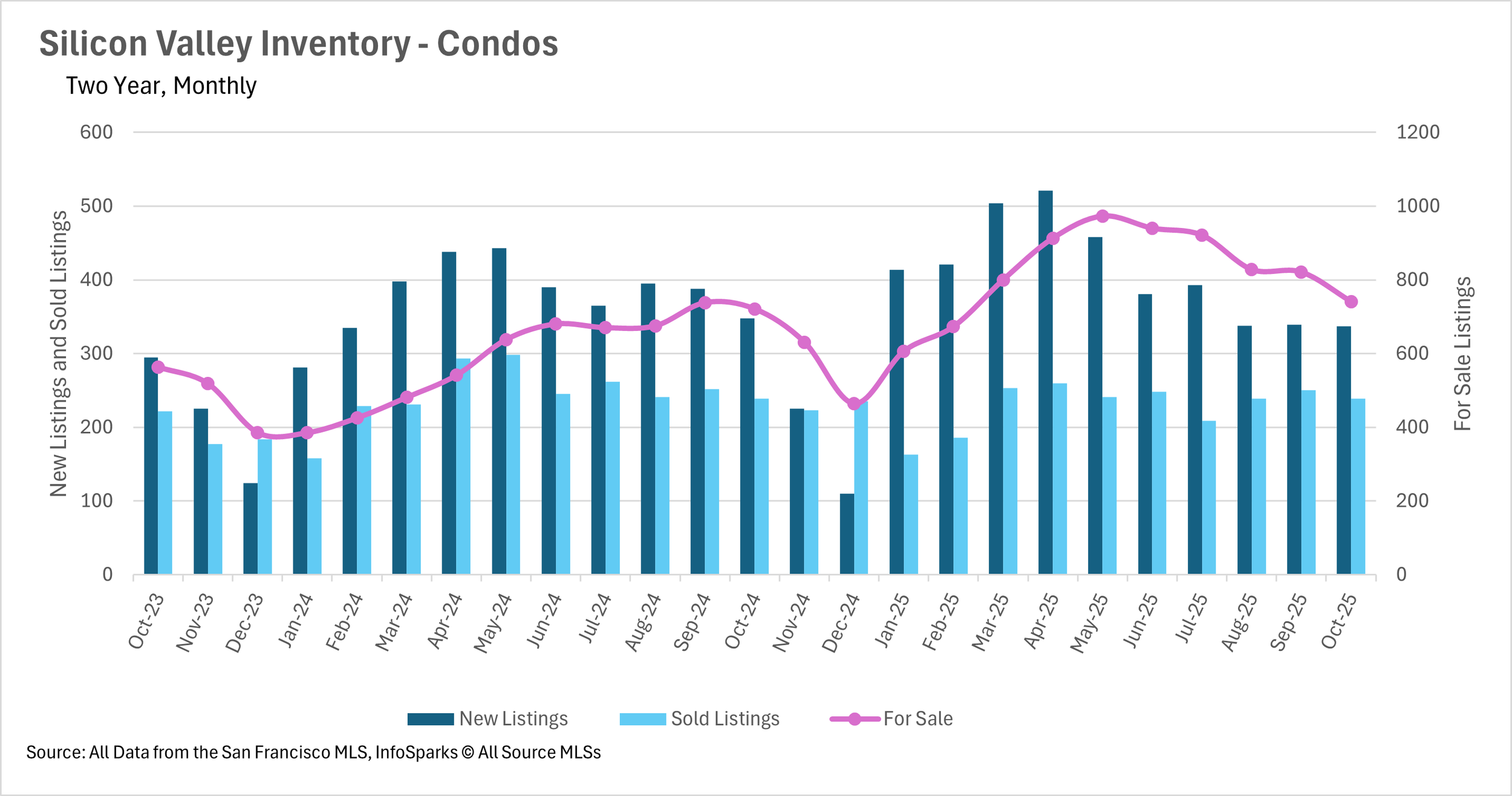 Like much of the rest of the state of California (and the broader country), inventories increased pretty dramatically in Silicon Valley throughout much of 2025. However, we’ve seen quite the reversal of this trend in the single-family home market. The single-family home market in Silicon Valley closed out the month of October with 8.72% fewer active listings than it had just one year ago, and 15.22% fewer active listings than the prior month. Much of this move can be attributed to the fact that there were 5.89% fewer new listings hitting the market, with roughly the same number of listings sold on a year-over-year basis. The condo market is also seeing this correction, although not nearly as drastically, with there currently being 2.77% more active condo listings when compared to last year.