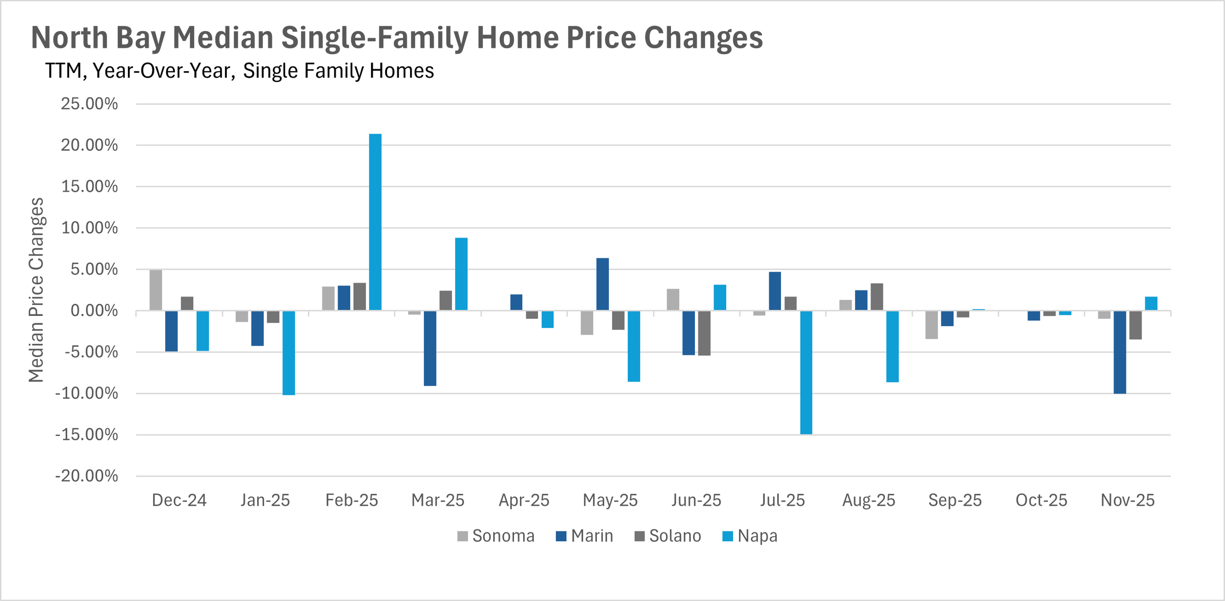 Throughout the month of November, most of the single-family market was relatively stable. We saw slight fluctuations in median sale price for single-family homes in Sonoma and Napa Counties, with the former declining in value by 0.99% on a year-over-year basis, and the latter increasing in value by 1.72% on a year-over-year basis. However, we saw much larger swings in Solano and Marin Counties, with median single-family homes selling for 3.50% less on a year-over-year basis in Solano County and 10.03% less in Marin County. As per usual, the condo market was remarkably volatile, with muted moves in median sale prices in Sonoma and Marin Counties, and big swings in Solano and Napa Counties. Solano County condos sold for 32.46% less when compared to last year, while Napa County condos sold for 65.35% more.