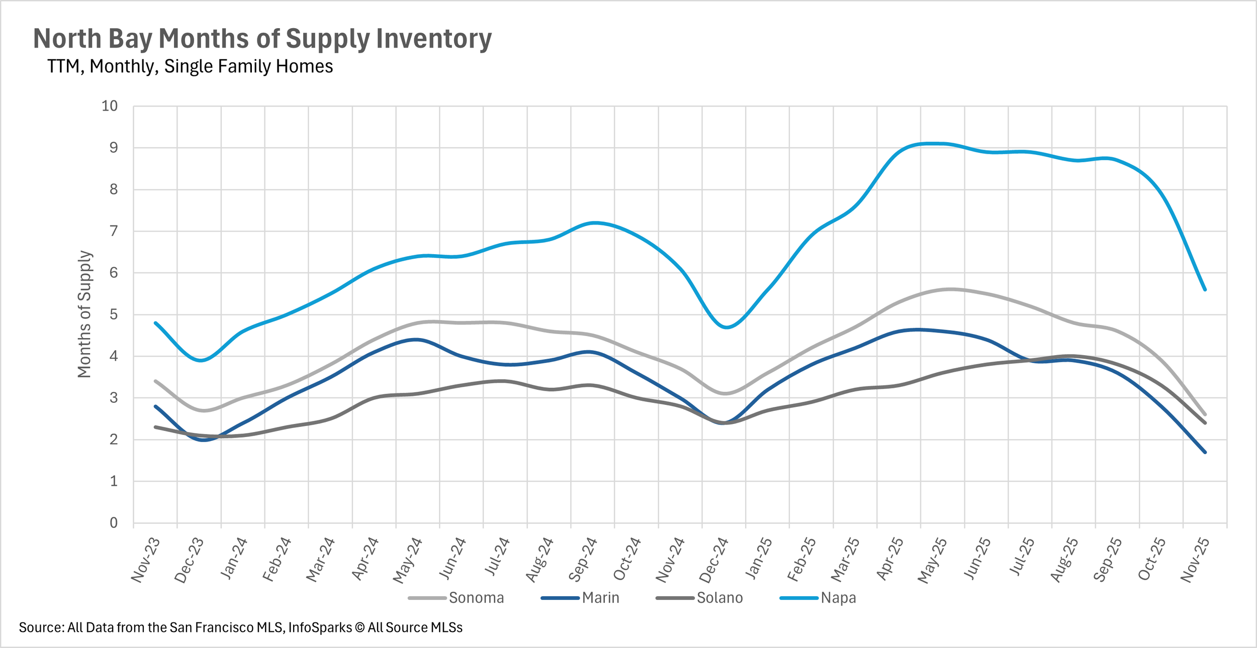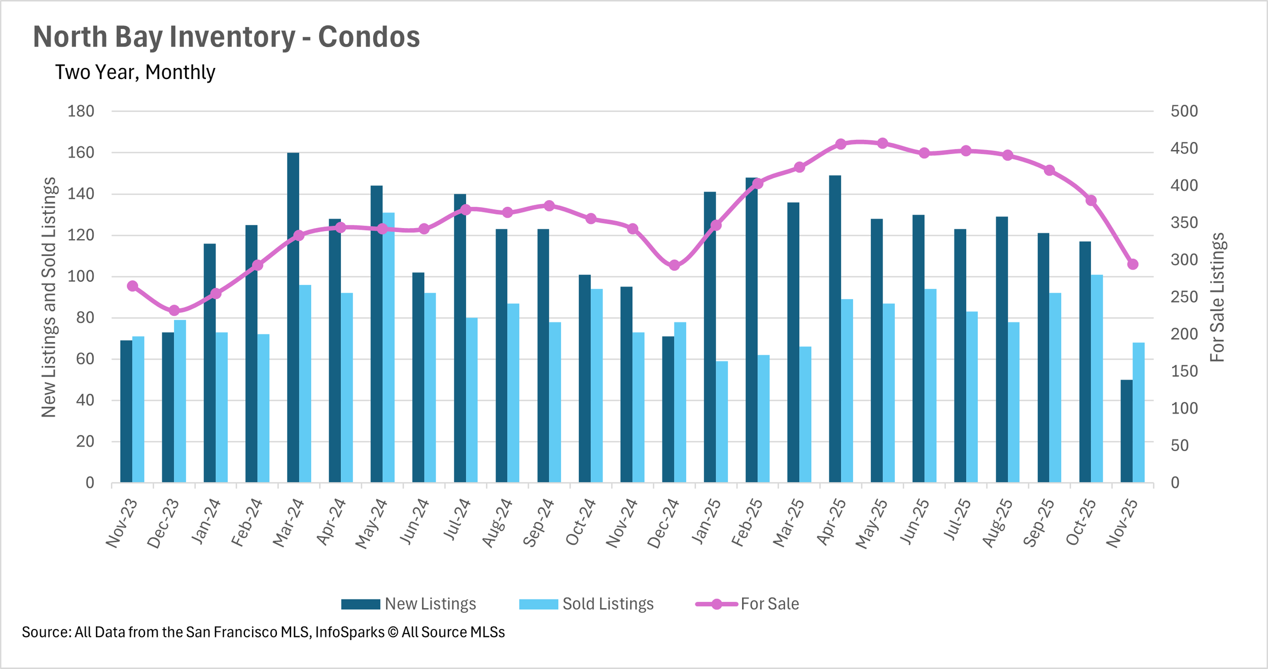 Although the headline here is shocking, it’s not exactly an outlier. We saw substantial year-over-year increases in the amount of time listings are spending on the market across the board. Single family homes are spending considerably more time on the market in Sonoma, Solano, and Napa Counties, with 32.50%, 20%, and 71.46% year-over-year increases in days on market, respectively. However, Marin County seems unphased, with the median home spending 31 days on the market in both November 2024 and November 2025. Likewise, Marin County condos are actually spending less time on the market with a year-over-year decrease of 26.83%!