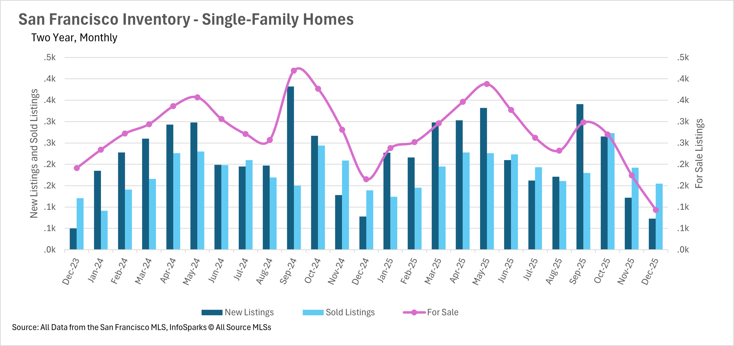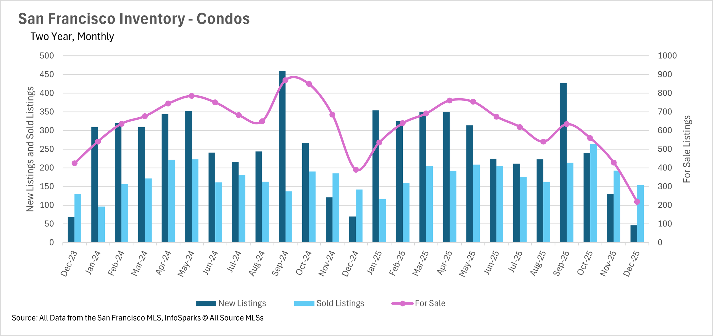 December brought an unprecedented decline in inventory levels across San Francisco. There are currently just 93 single-family homes for sale in the entire city, representing a staggering 43.64% year-over-year decline. The condo market experienced a similar contraction, with inventory dropping by 44.10% to just 218 units. Combined, there are only 311 homes for sale in San Francisco, making it extraordinarily difficult for buyers to find suitable properties. Until more homeowners decide to list their properties, this severe inventory shortage will continue to define the market.