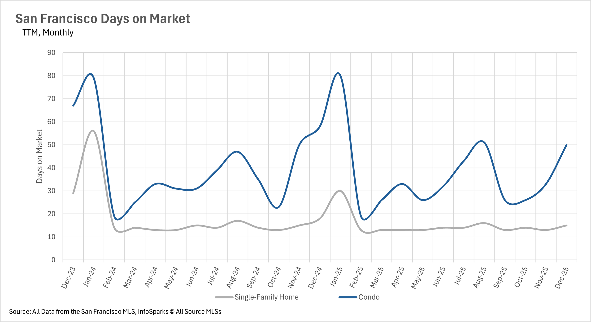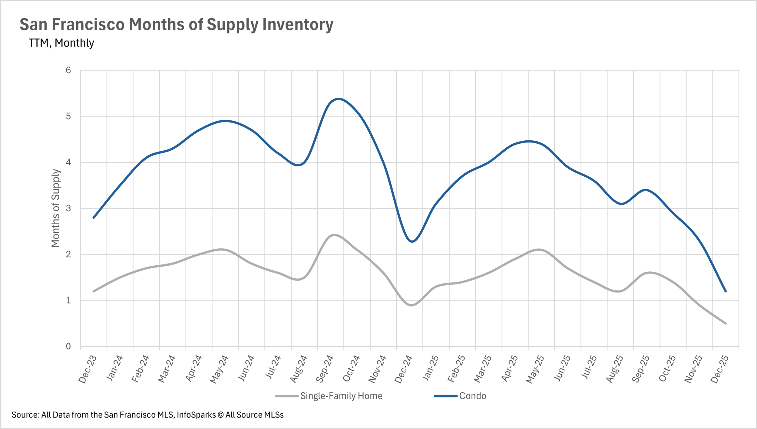With just 0.5 months of single-family home inventory and 1.2 months of condo inventory on the market, San Francisco has become a deeply entrenched seller's market across all property types. These are some of the lowest MSI figures we've seen in years, and there is no indication that conditions will ease for buyers any time soon. Until significant new inventory enters the market, sellers will continue to hold all the cards in San Francisco.