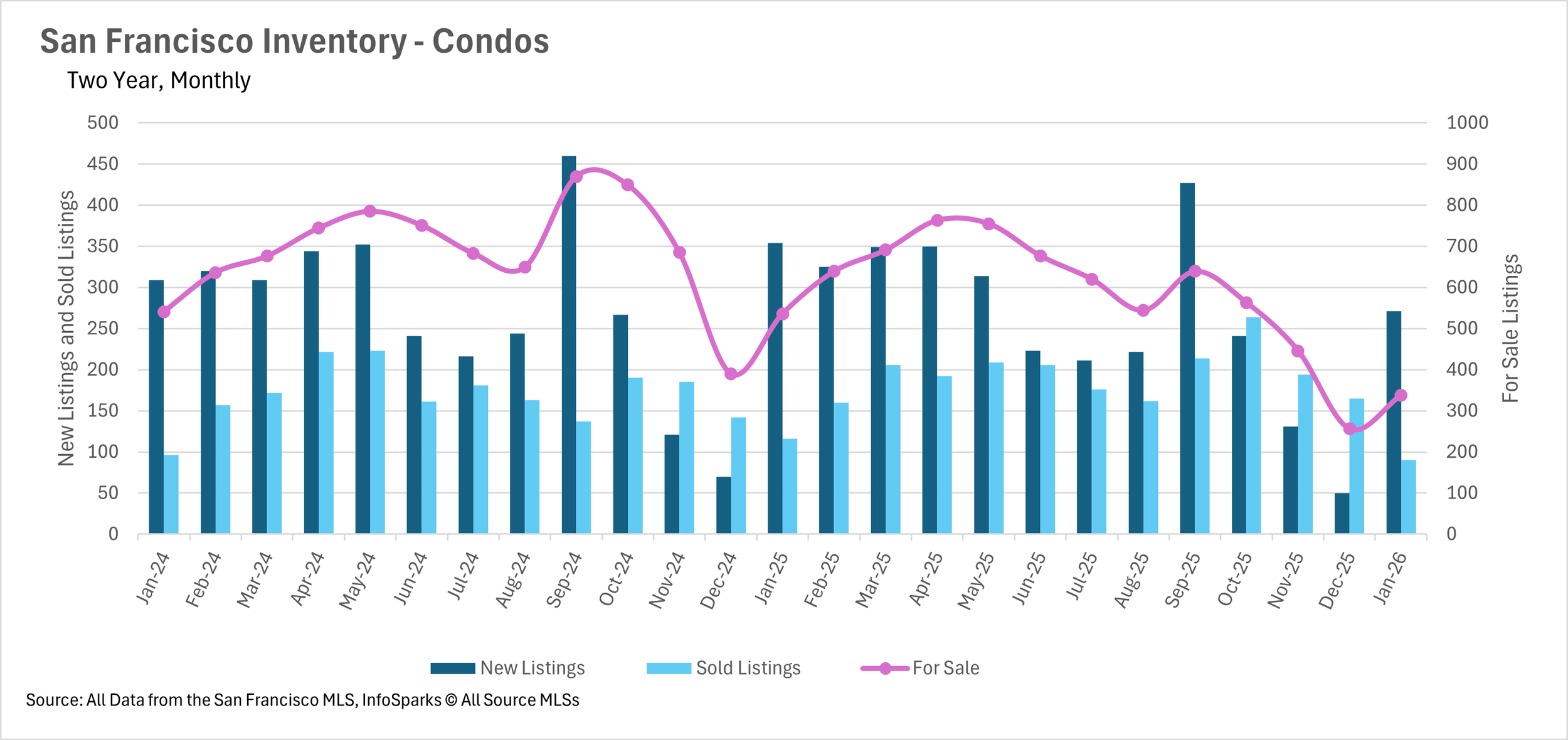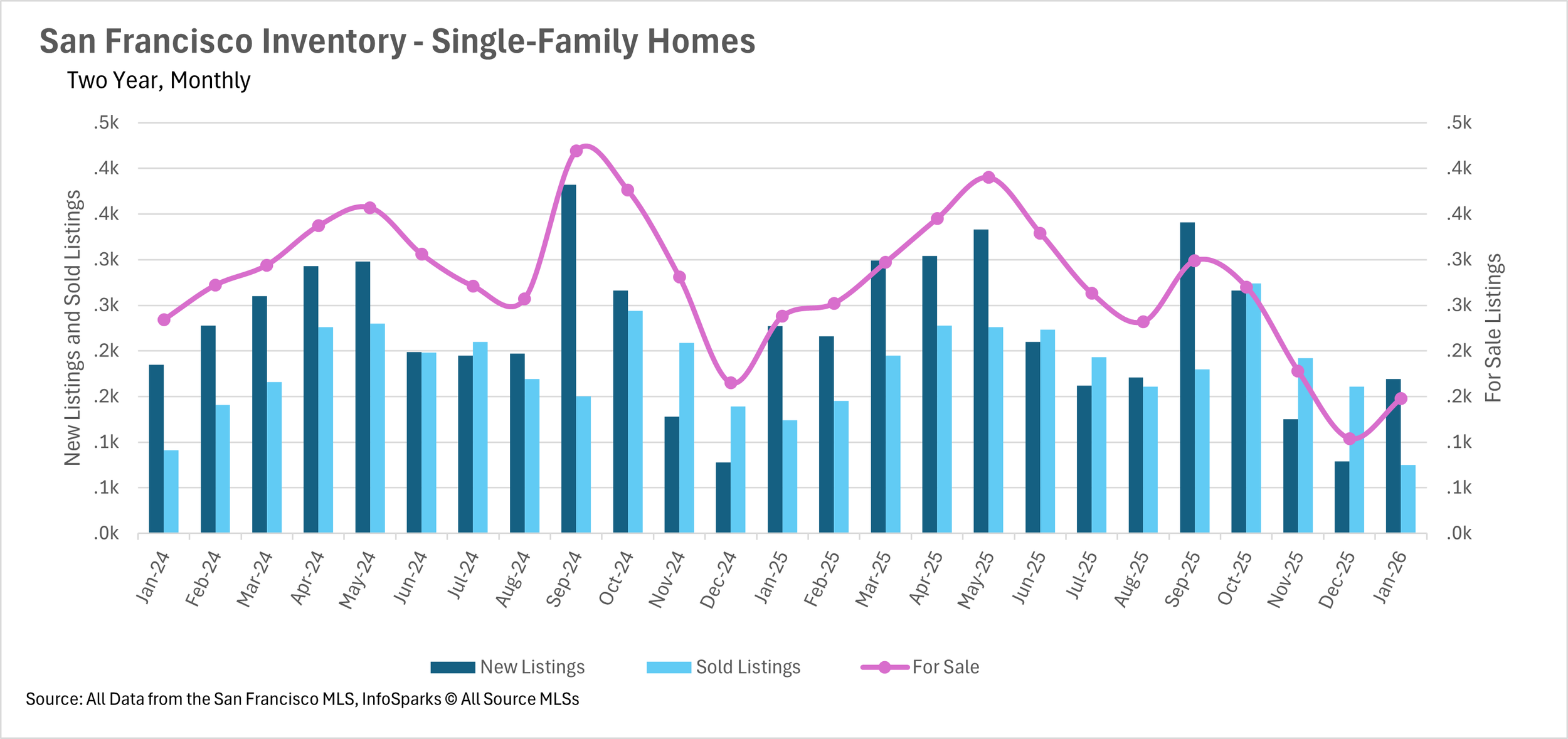 The inventory shortage that defined the end of 2025 has carried over into the new year. There are currently just 148 single-family homes for sale in San Francisco, representing a 37.82% decline compared to January 2025. The condo market is facing similar constraints, with inventory down 36.94% year-over-year to just 338 units. Combined, there are fewer than 500 homes available for sale in the entire city. While new listings did pick up from December's lows, the market remains starved for inventory, and buyers continue to face an extremely limited selection of properties.