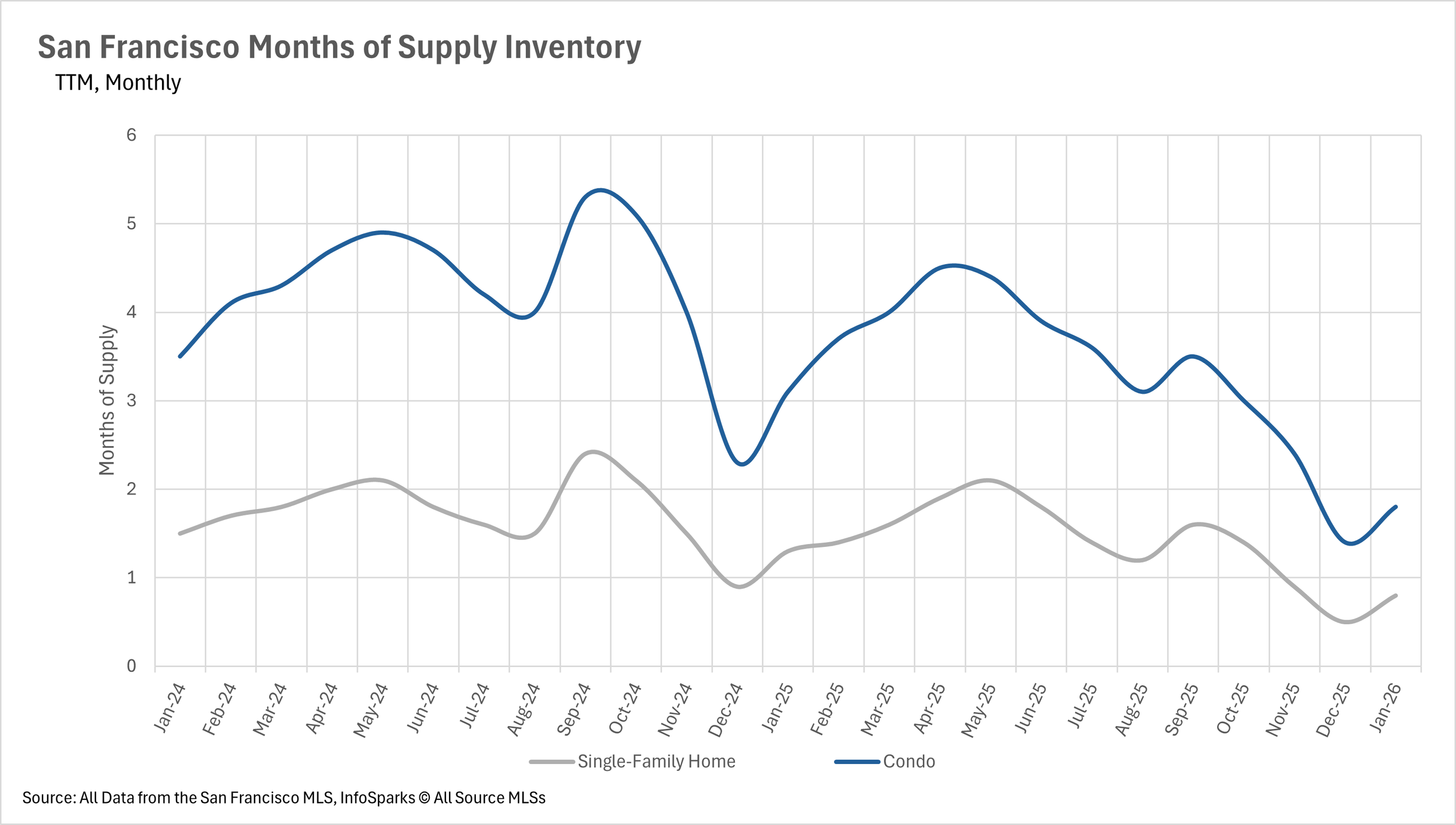 With just 0.8 months of single-family home inventory and 1.8 months of condo inventory on the market, the entire San Francisco market remains a strong seller's market. Both property types are well below the three-month threshold, giving sellers significant leverage in negotiations. Until substantial new inventory enters the market, buyers will continue to face stiff competition and limited options throughout San Francisco.