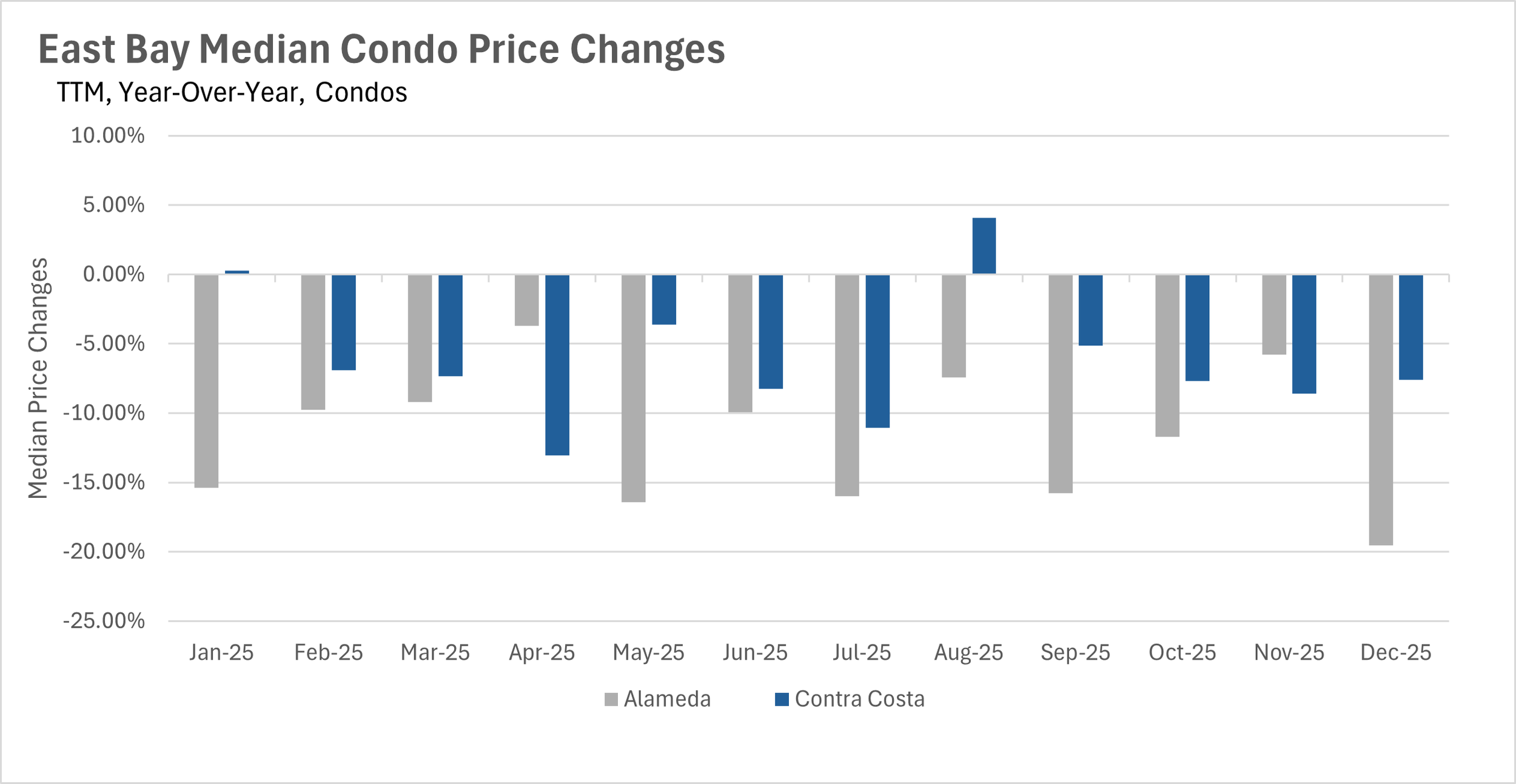 The single-family home market in the East Bay ended the year on a relatively stable note. In December, the median single-family home in Alameda County sold for $1,170,000, representing a modest 0.47% increase on a year-over-year basis. Meanwhile, Contra Costa County saw the median single-family home sell for $839,500, a slight 1.81% decline compared to last year. The condo market, however, tells a very different story. Alameda County condos saw a steep 19.55% year-over-year decline in median sale price, with the median condo selling for just $522,500. Contra Costa County condos fared somewhat better but still declined by 7.60%, with the median condo selling for $462,000. This divergence between single-family homes and condos has been a recurring theme throughout 2025.
