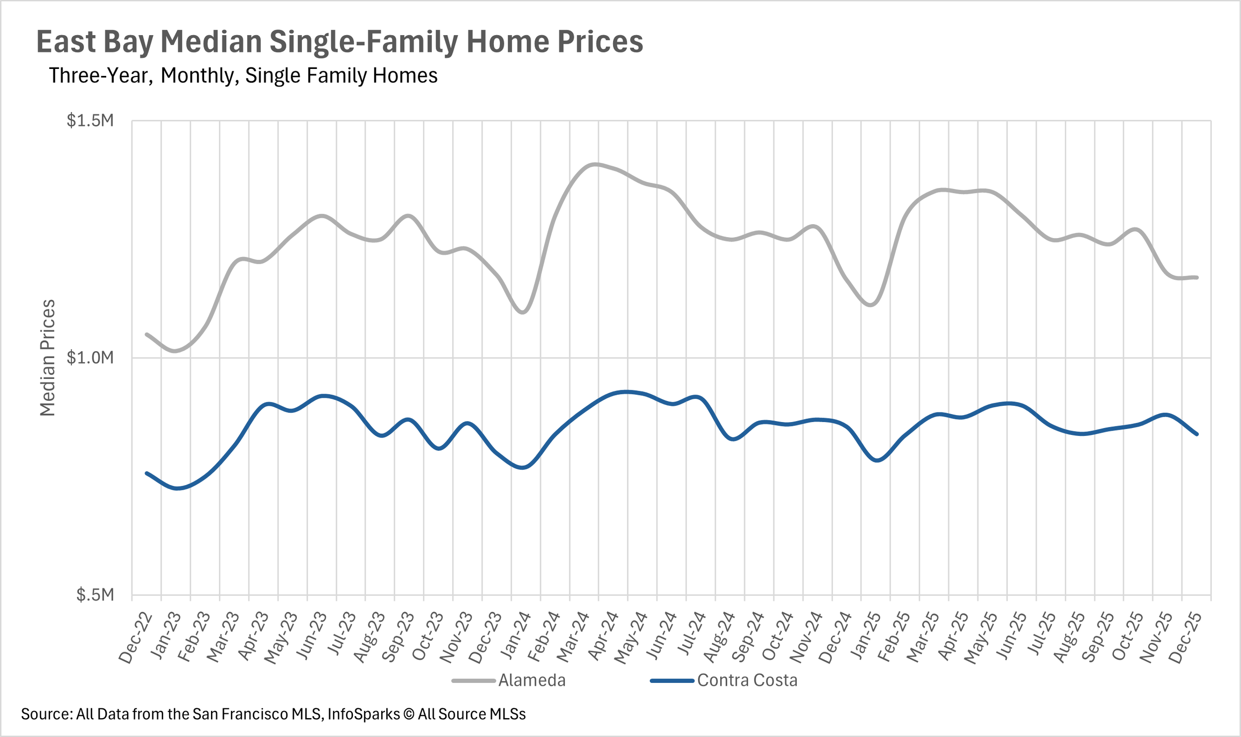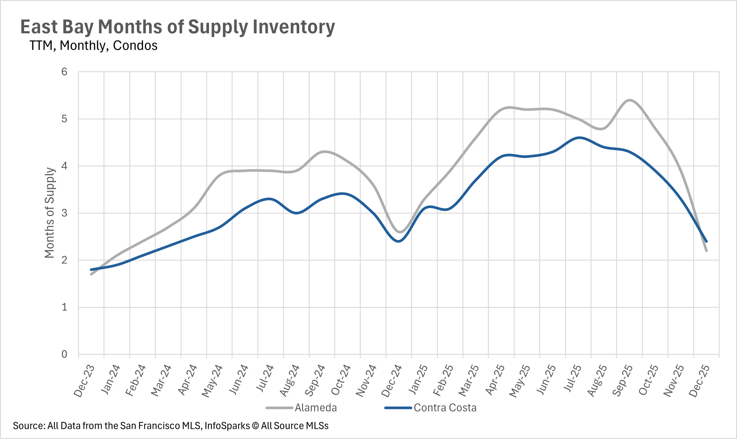 The East Bay ended December as a strong seller's market across the board. The single-family home market is especially tight, with just 0.8 months of inventory in Alameda County and 1.2 months in Contra Costa County. This represents a 20% year-over-year decline in both counties and signals that buyers looking for single-family homes will face stiff competition heading into the new year. Even the condo market, which has struggled throughout 2025, has tightened considerably. Alameda County ended the month with 2.2 months of condo inventory, while Contra Costa County had 2.4 months. Both figures represent significant declines from earlier in the year and put the condo market firmly into seller's market territory as well.