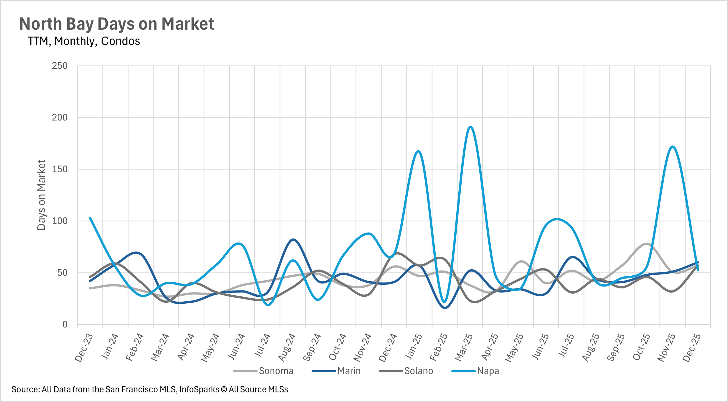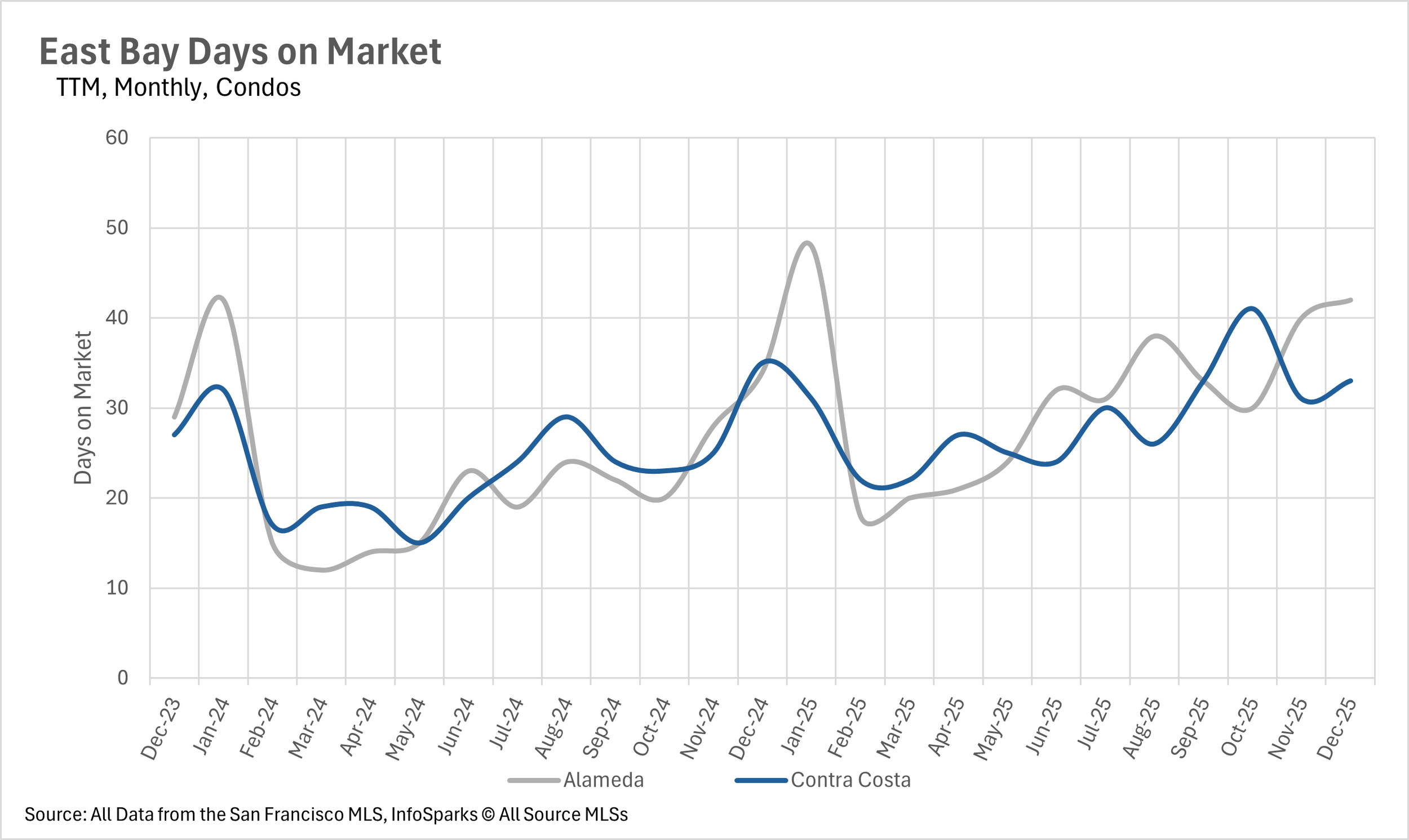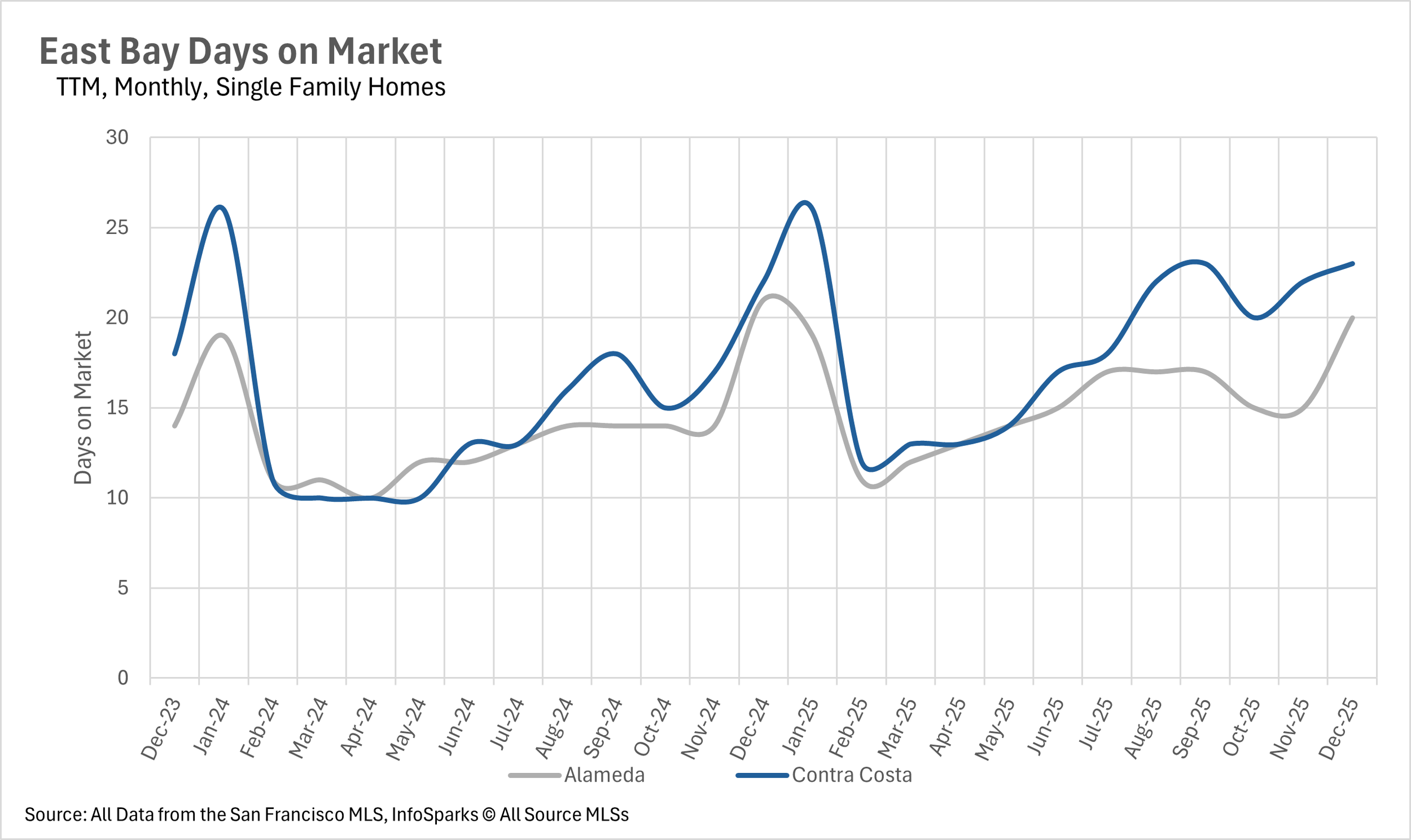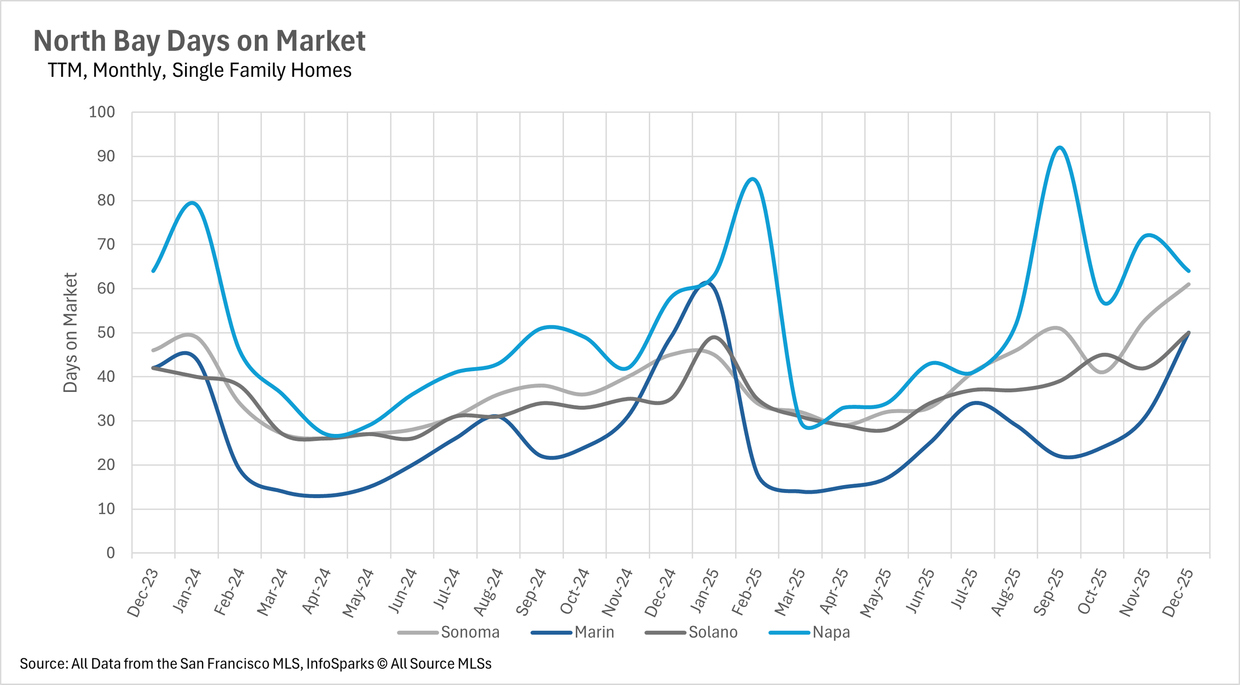 Days on market trends diverged sharply across the region, with San Francisco and parts of the East Bay accelerating while other areas like Santa Cruz County experienced significant slowdowns despite tight inventory.