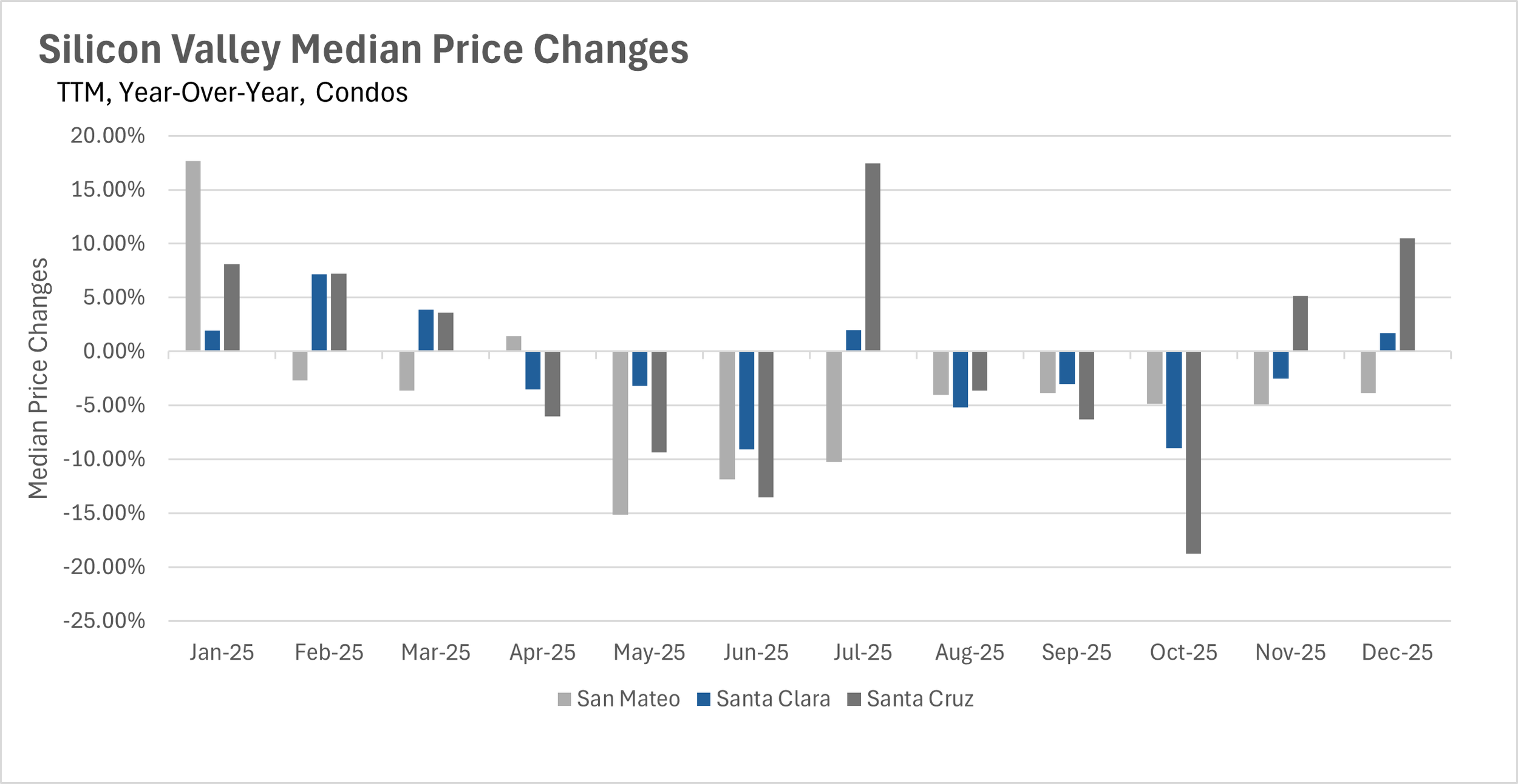 December brought mixed price performance across the Bay Area, with San Francisco leading appreciation while other regions showed varying results. San Francisco ended 2025 on a high note with single-family homes gaining 8.63% year-over-year to reach a median of $1,662,000, while condos rose 5.21% to $1,075,000. Single-family homes continue commanding significant premiums, selling for nearly 13% over asking price. Silicon Valley experienced a December rebound after November's rare across-the-board declines, with San Mateo County leading at 9.74% year-over-year gains to $1,887,500, while Santa Clara County saw a modest 0.55% decline to $1,800,000 and Santa Cruz remained relatively stable with a 0.79% increase to $1,270,000. Silicon Valley condos showed volatility, with San Mateo down 3.84%, Santa Clara up 1.71%, and Santa Cruz surging 10.48%.