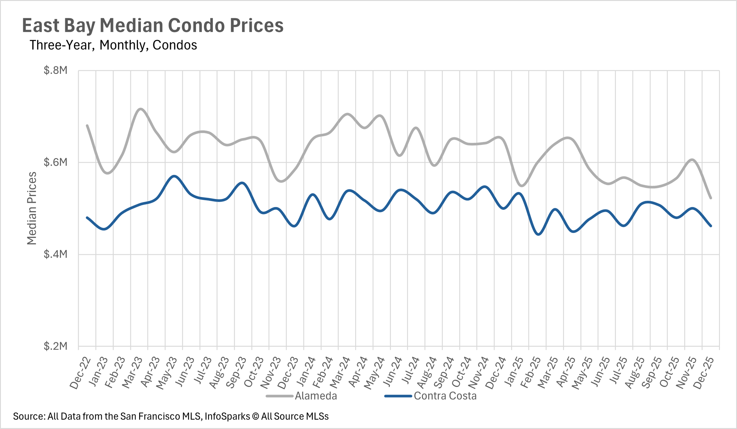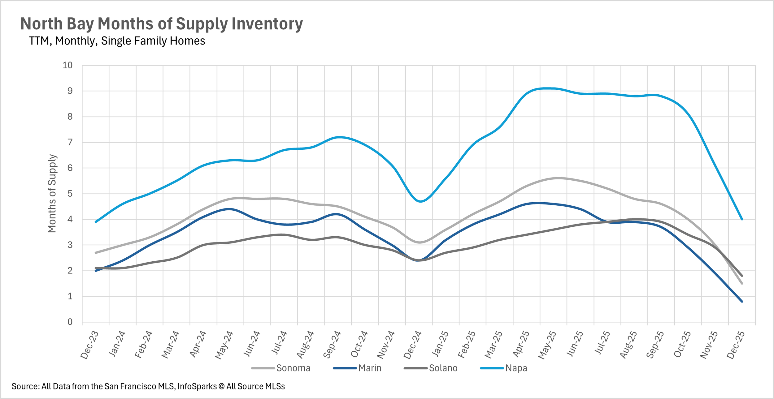 The East Bay ended the year with extraordinarily tight conditions, posting just 0.8 months of single-family inventory in Alameda County and 1.2 months in Contra Costa (both down 20% year-over-year), while even condos entered seller's territory at 2.2 and 2.4 months respectively. The North Bay experienced a dramatic holiday season shift, with Marin County leading at an extreme 0.8 months of single-family supply (down 66.67% year-over-year), Sonoma at 1.5 months, Solano at 1.8 months, and even Napa - which had been a strong buyer's market throughout 2025 - dropping to 4.0 months. North Bay condos also tightened considerably with Marin at 2.0 months, Sonoma at 2.2 months, and Solano and Napa at 3.5 and 3.7 months respectively. This region-wide transformation into seller's market territory, combined with historically low new listing activity, suggests intense competition will continue into early 2026 until significant new inventory enters the market.