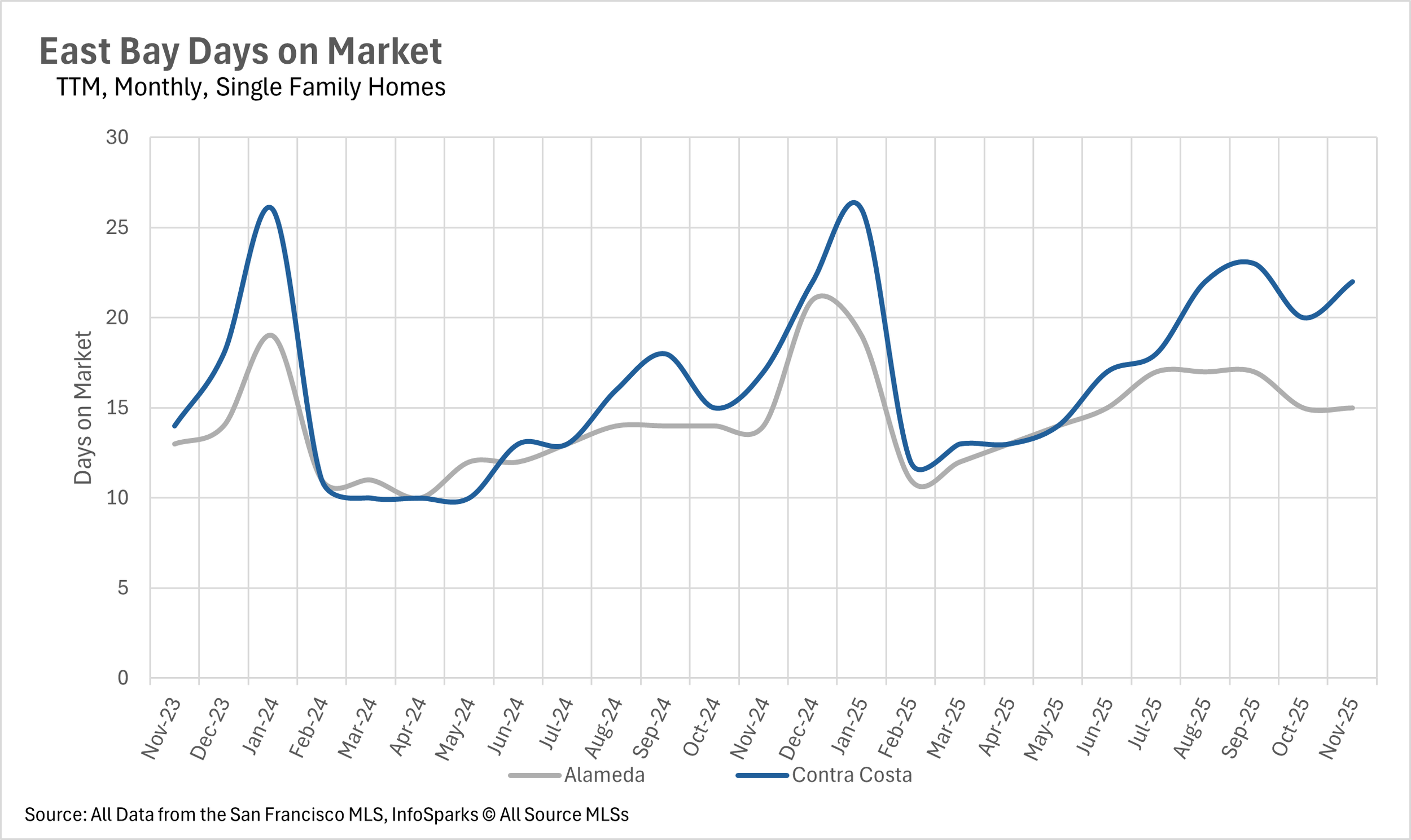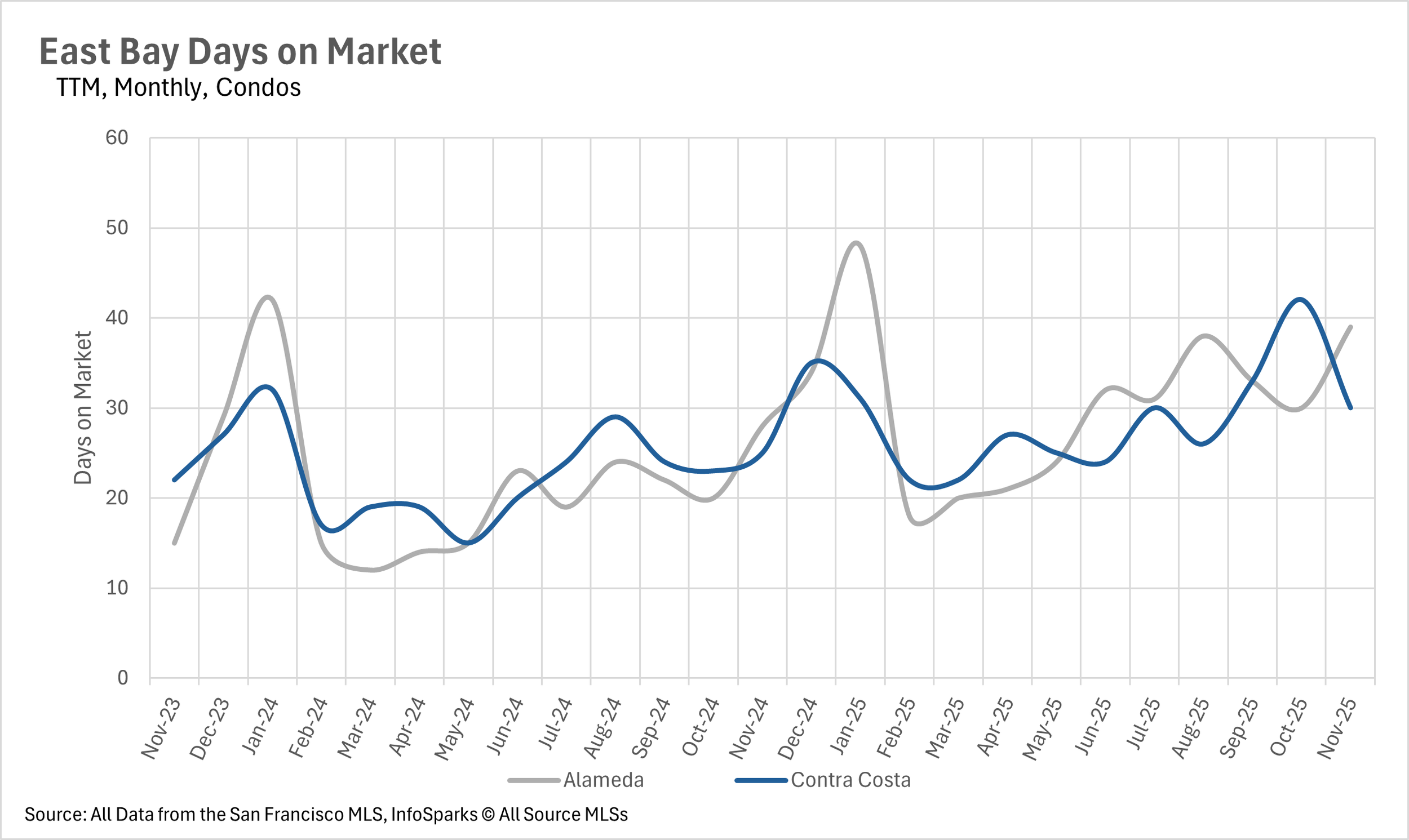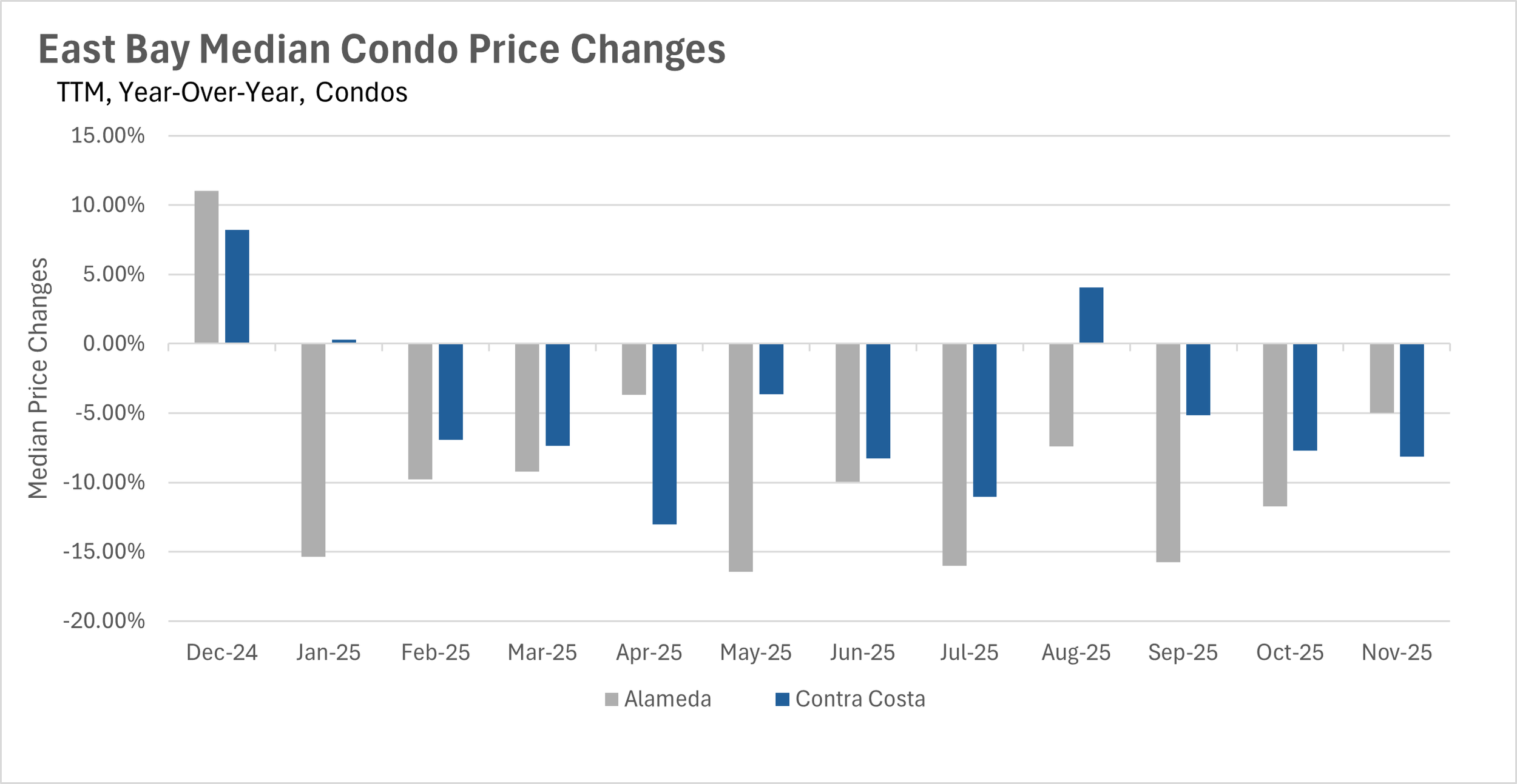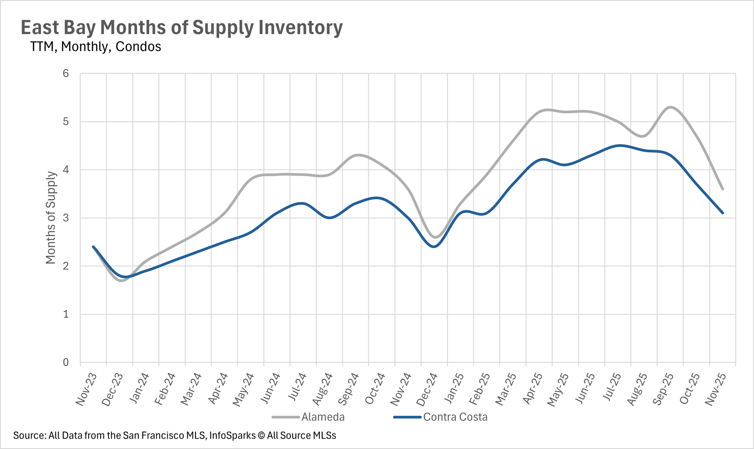 In the month of November, we saw very little movement on a year-over-year basis in terms of months of supply on the market. There were 1.4 and 1.8 months of single-family inventory on the market in Alameda and Contra Costa Counties, respectively, putting it firmly into sellers market territory. Whereas the condo market is a buyers market, as there were 3.6 and 3.1 months of inventory on the market in Alameda and Contra Costa Counties, respectively.
