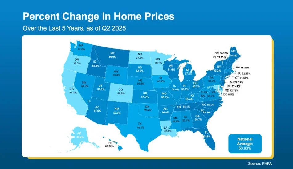 1. Significant Home Price Growth. According to the Federal Housing Finance Agency (FHFA), home prices have jumped by nearly 54% nationwide over the last five years (see map below):