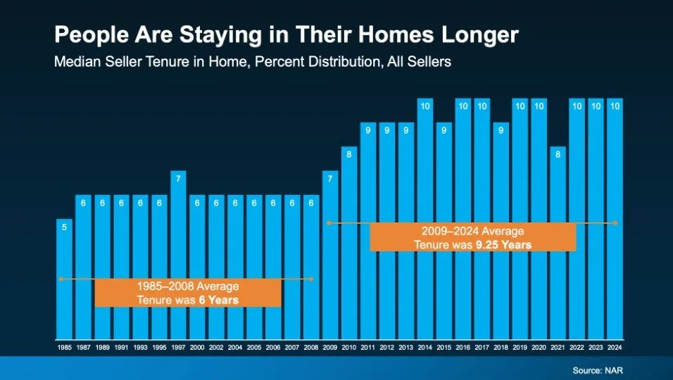 2. People Are Living in Their Homes Longer. Data from the National Association of Realtors (NAR), shows the average homeowner stays in their home for about 10 years now (see graph below):