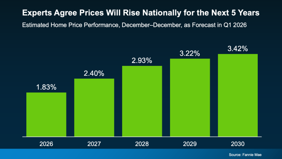 In fact, Fannie Mae surveyed over 100 housing market experts to ask their opinions on where prices are headed from here. And the experts agree, nationally, prices are expected to keep rising over the next five years:
