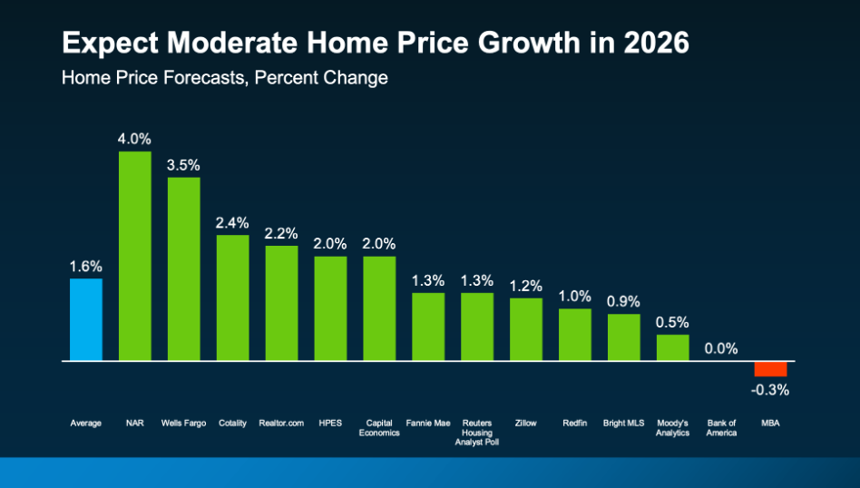 With more homes for sale, there isn’t as much upward pressure on prices right now. And we’ve seen that shake out over the past year. Even so, the overwhelming majority of experts say, nationally, prices will continue rising in the year ahead – just at a slower pace. On average, they say prices will rise by 1.6% in 2026 (see graph below):
