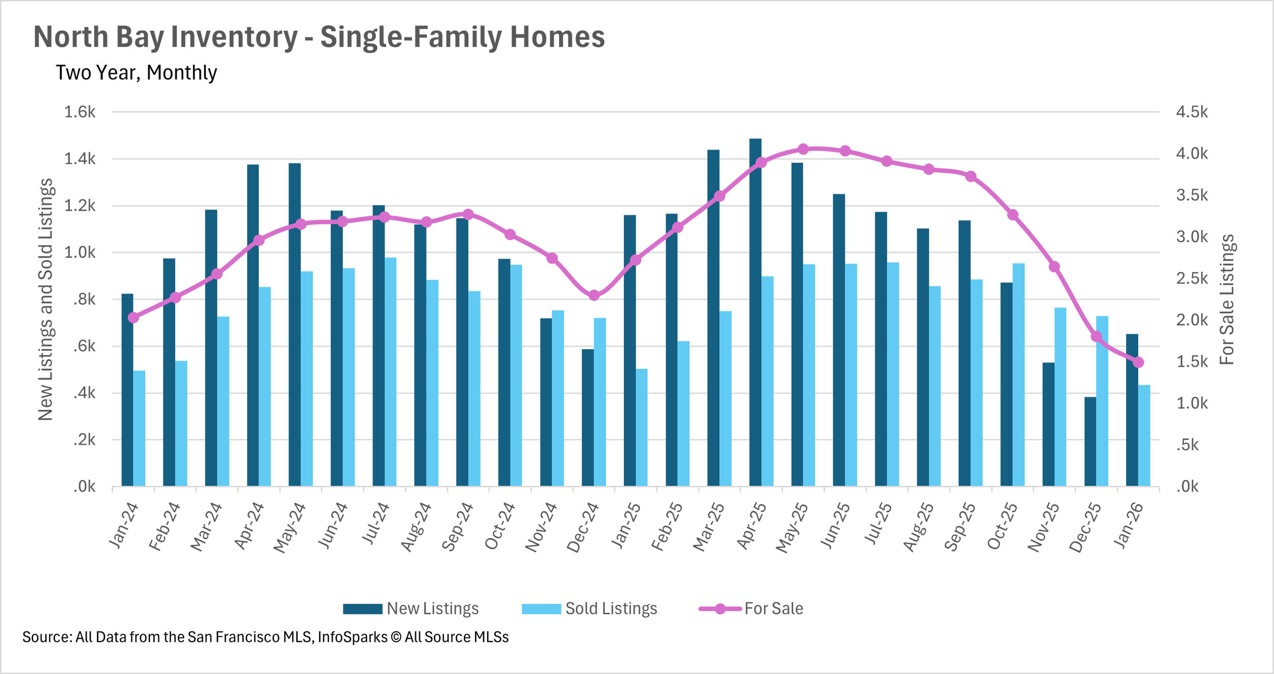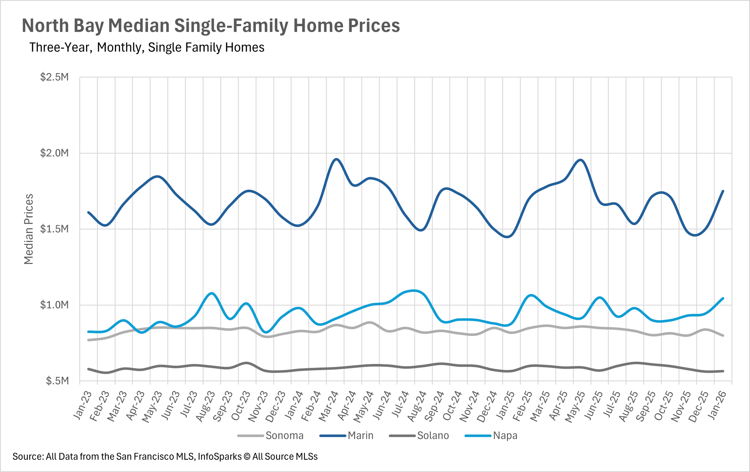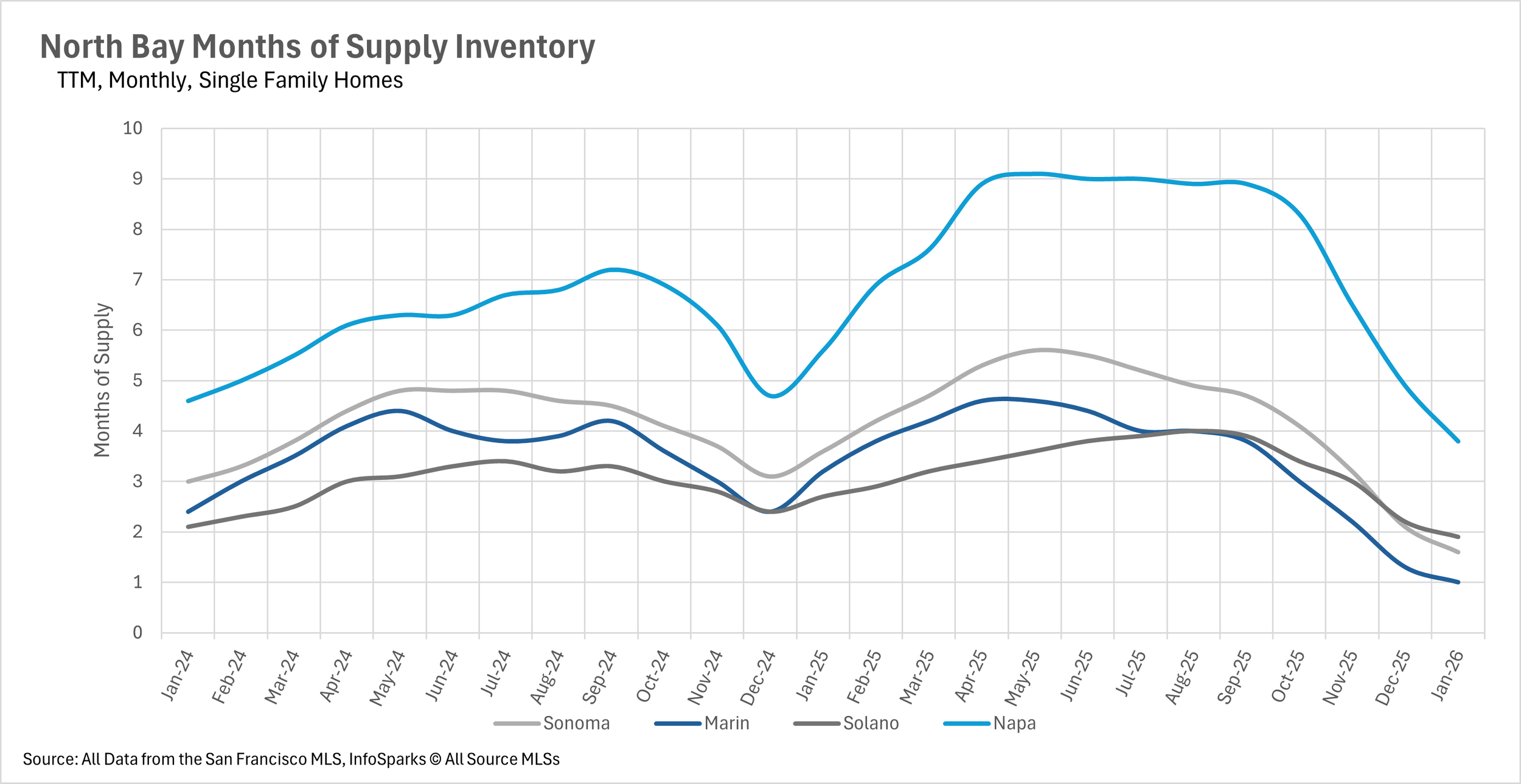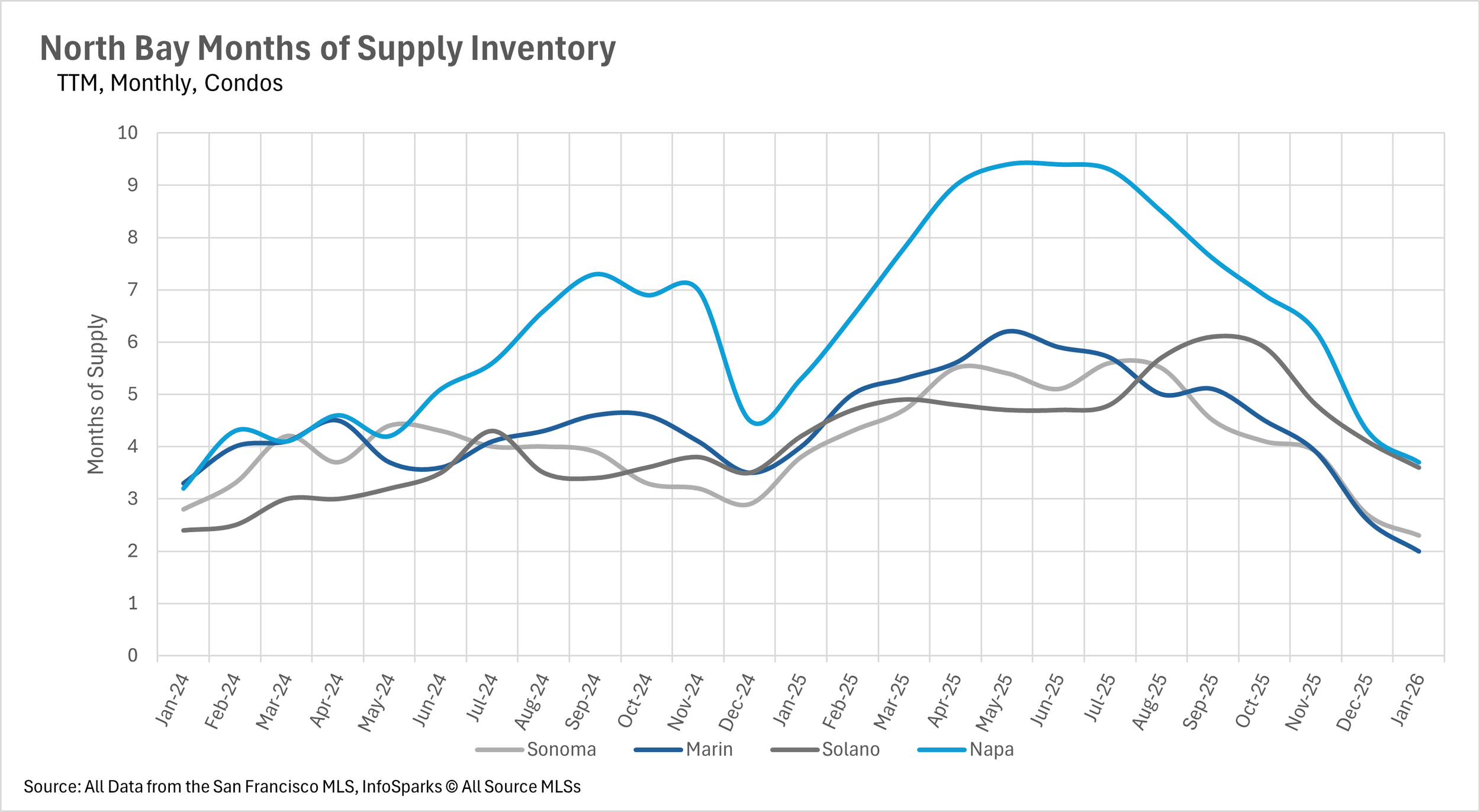 January brought seller's market conditions to nearly every corner of the Bay Area's single-family home market. San Francisco and Santa Clara County are sitting at just 0.8 and 0.9 months of supply, respectively, while Marin County has just 1 month of supply, down an incredible 68.75% year-over-year. Alameda County has 1.1 months, Contra Costa County has 1.5 months, and Sonoma County has 1.6 months. Even Napa County, which was a strong buyer's market throughout much of 2025, has dropped to 3.8 months. The condo market has also tightened considerably, though a few pockets remain in buyer's market territory, including Santa Cruz County at 3.3 months, Solano County at 3.6 months, and Napa County at 3.7 months. With inventory at historically low levels and the busy spring selling season right around the corner, sellers are in an excellent position heading into the next few months.