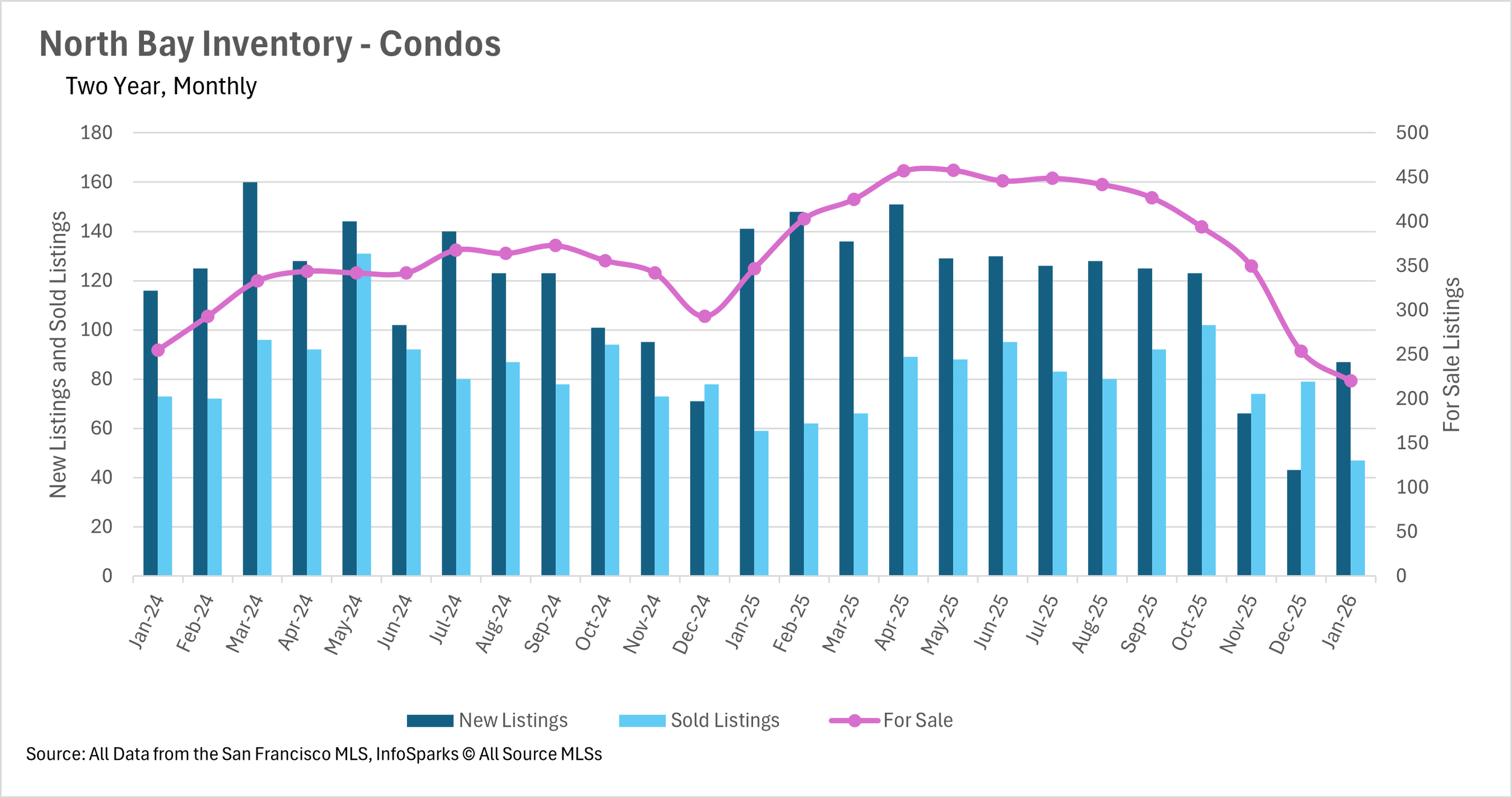 One of the biggest stories heading into 2026 is the dramatic decline in inventory across the Bay Area. After inventories built up throughout the spring and summer of 2025, the correction has been swift and severe. The North Bay saw the most dramatic contraction, with single-family home inventory plummeting 45.19% on a year-over-year basis and condo inventory dropping 36.60%. San Francisco isn't far behind, with single-family inventory down 37.82% and condo inventory down 36.94%, leaving fewer than 500 homes available for sale in the entire city. The East Bay saw declines of 18.58% for single-family homes and 20.03% for condos, while Silicon Valley's single-family inventory is down 12% year-over-year. New listings are beginning to pick up after the holiday slowdown, but they remain well below last year's levels in most markets. Until sellers begin entering the market in greater numbers, buyers will continue to face extremely limited options.