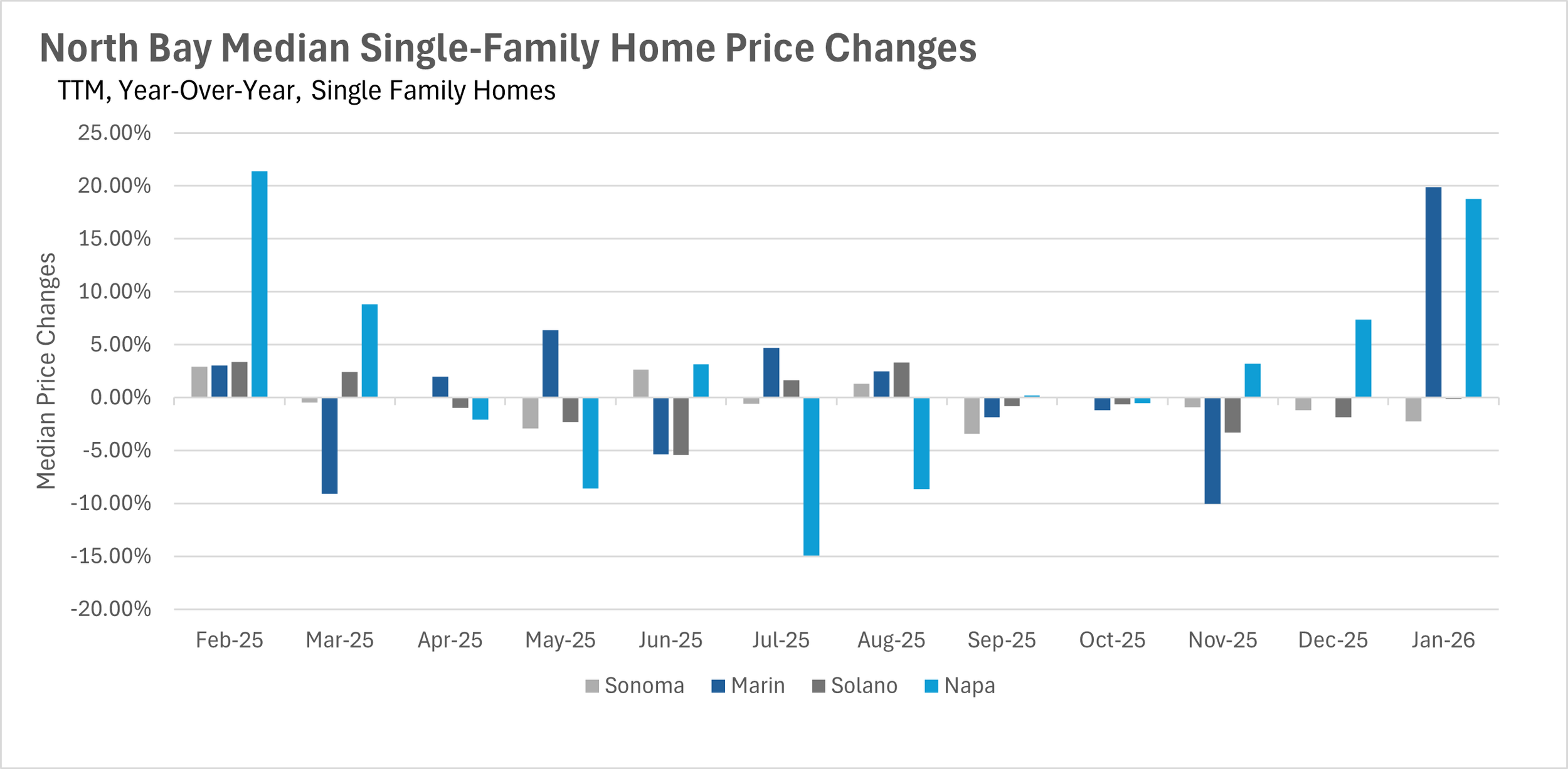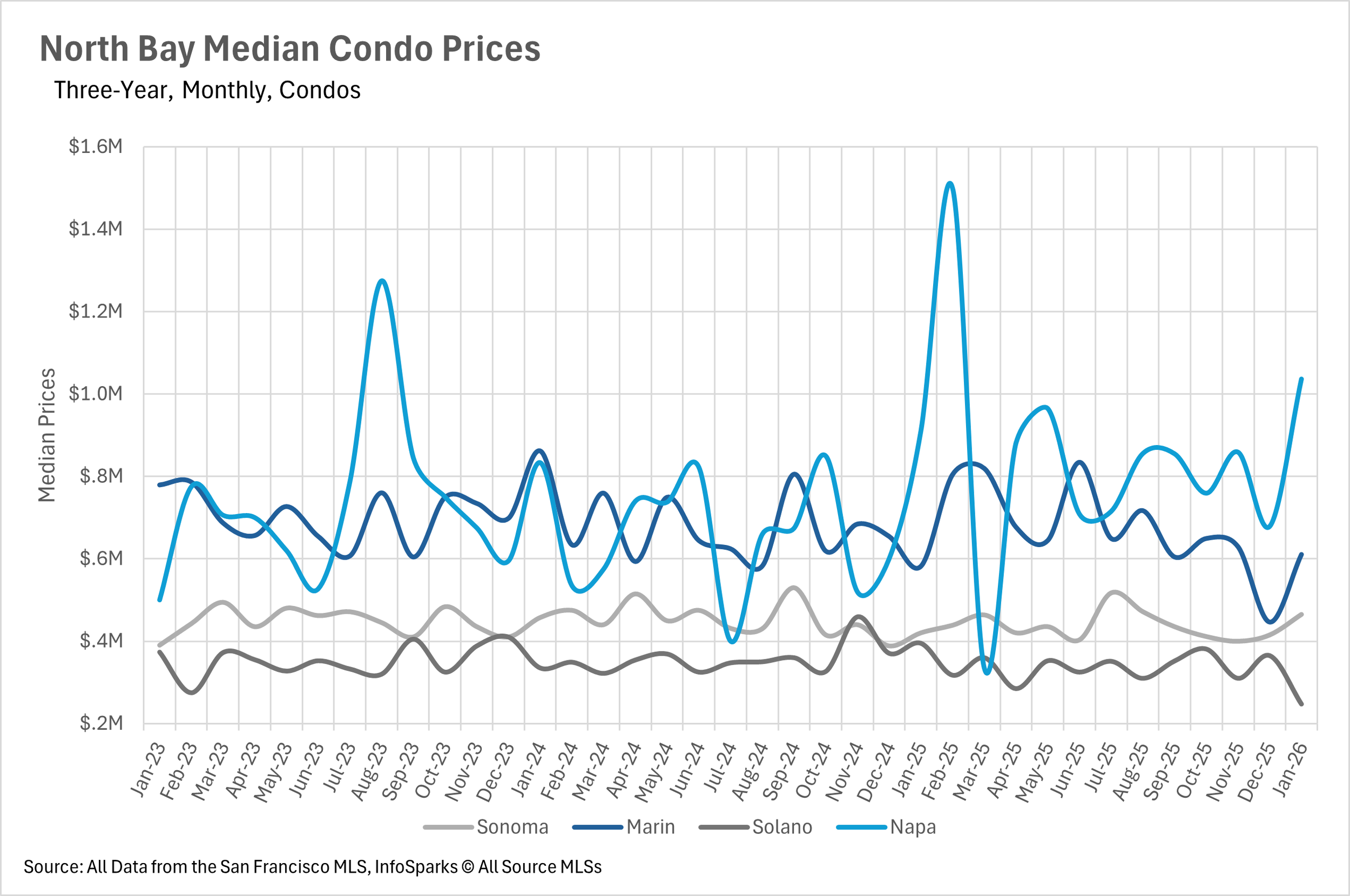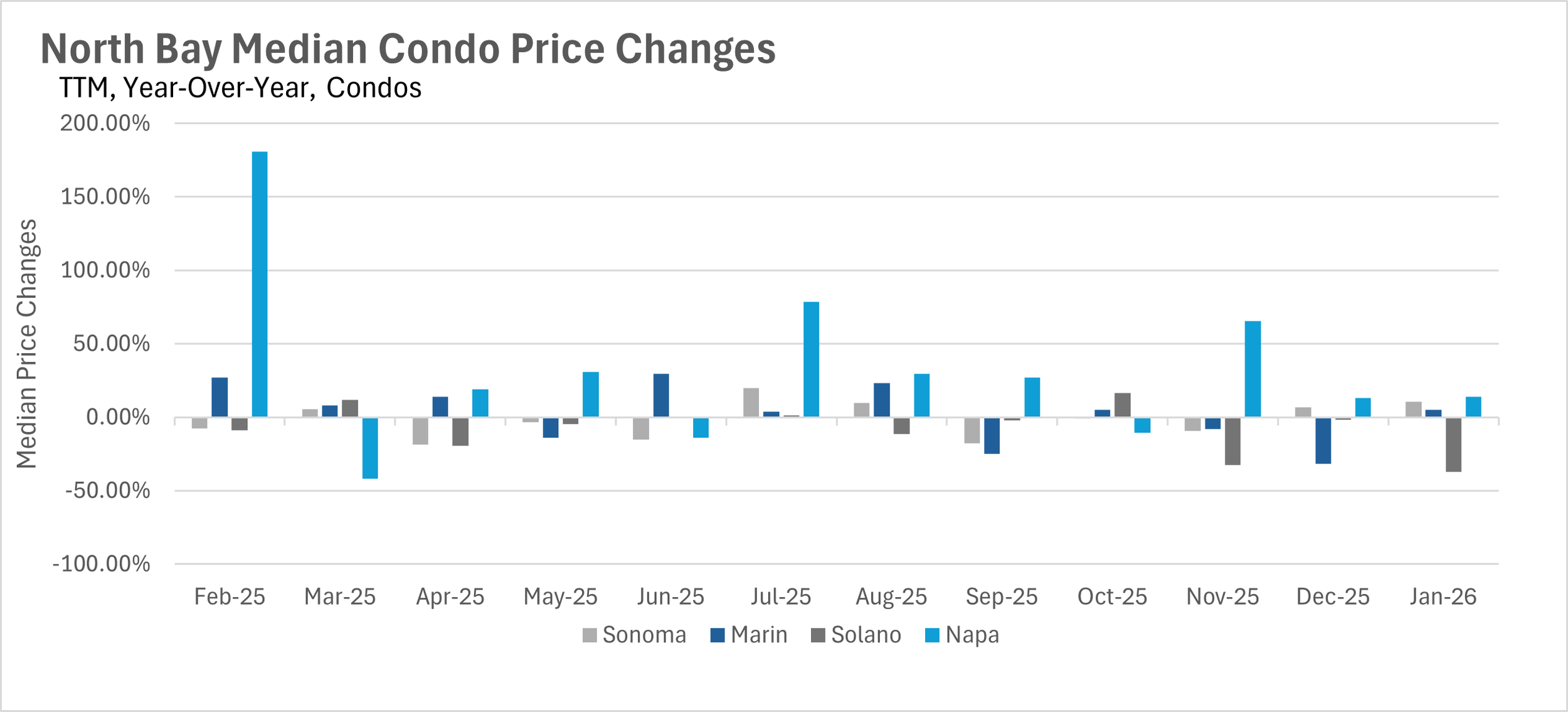 The Bay Area kicked off 2026 with some truly remarkable price appreciation in several key markets. San Francisco's single-family home market posted a stunning 16.23% year-over-year increase in median sale price, with the median home selling for $1,653,325. Not to be outdone, Marin County saw its median single-family home sell for $1,750,000, a 19.86% year-over-year jump. Napa County also posted impressive gains, with single-family homes up 18.75% to a median of $1,045,000. However, not every market is experiencing this level of growth. Santa Clara County saw its median single-family home price decline by 3.89%, while Sonoma and Solano Counties also posted slight year-over-year declines. The condo market continues to tell a very different story, with declines across Silicon Valley and significant weakness in Contra Costa County, where the median condo sold for 14.39% less than it did last January. San Francisco condos were a bright spot, posting a modest 2.77% year-over-year gain.