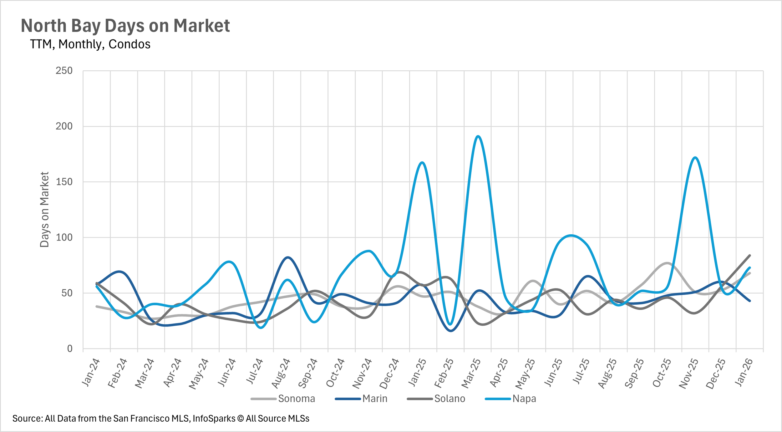 The gap between the single-family home market and the condo market continues to widen when it comes to how long listings are spending on the market. In San Francisco, the average single-family home is selling in just 13 days, a 56.67% decrease compared to last January. Alameda County single-family homes are also moving at a brisk pace, selling in just 19 days on average. However, the condo market is a completely different animal. Santa Clara County condos are spending an average of 55 days on the market, a 57.14% year-over-year increase, while Santa Cruz County condos are sitting for 67 days, more than double what we saw in January 2025. In the North Bay, Sonoma County single-family homes are spending 44.44% more time on the market despite plummeting inventory levels, suggesting that even in a tight market, buyers are being cautious and deliberate with their offers.