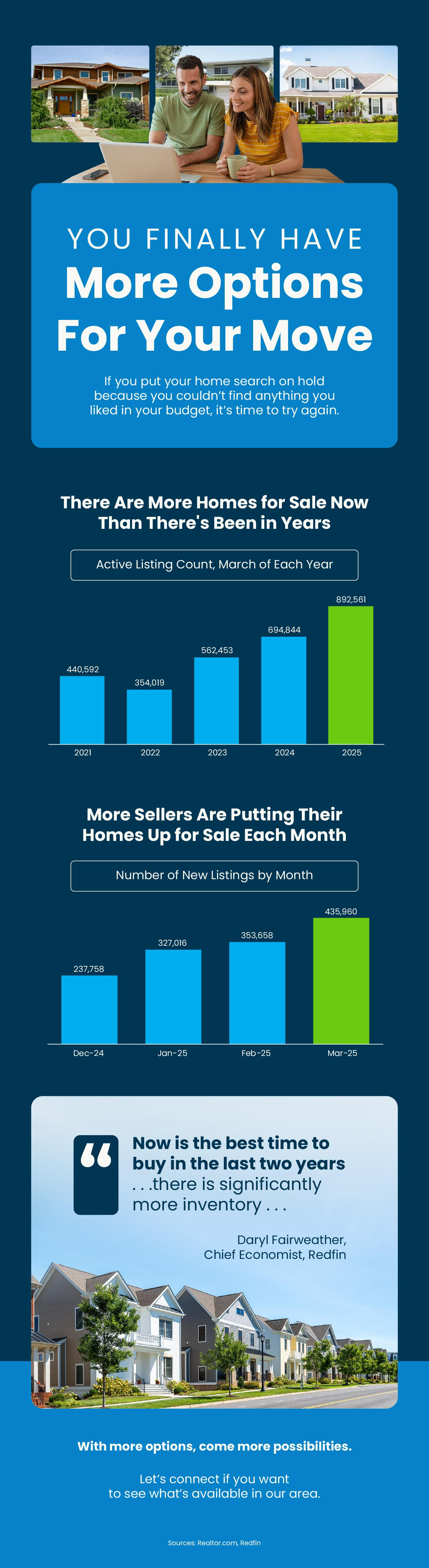 If you put your home search on hold because you couldn’t find anything you liked in your budget, it’s time to try again. There’s a much wider selection of homes for sale, with more fresh listings hitting the market each month. With more options come more possibilities. Let’s connect if you want to see what’s available in our area.
